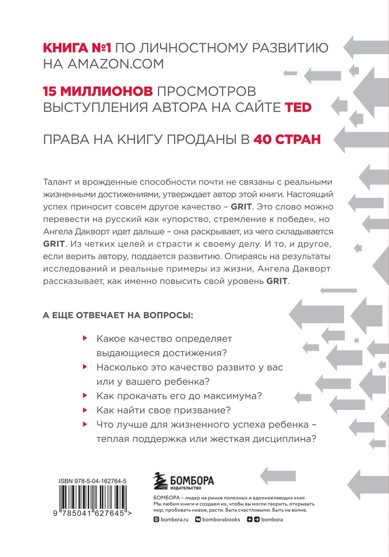 КНИГА № 1 ПО ЛИЧНОСТНОМУ РАЗВИТИЮ НА Amazon.com. 15 МИЛЛИОНОВ ПРОСМОТРОВ ВЫСТУПЛЕНИЯ АВТОРА НА САЙТЕ TED. ПРАВА НА КНИГУ ПРОДАНЫ В 40 СТРАН. Талант и врожденные способности почти не связаны с реальными жизненными достижениями, утверждает автор этой книги. Настоящий успех приносит совсем другое качество - GRIT. Это слово можно перевести на русский как упорство, стремление к победе, но Ангела Дакворт идет дальше - она раскрывает, из чего складывается GRIT. Из четких целей и страсти к своему делу. И то, и другое, если верить автору, поддается развитию. Опираясь на результаты исследований и реальные примеры из жизни, Ангела Дакворт рассказывает, как именно повысить свой уровень GRIT. А еще отвечает на вопросы: - Какое качество определяет выдающиеся достижения? - Насколько это качество развито у вас или у вашего ребенка? - Как прокачать его до максимума? - Как найти свое призвание? - Что лучше для жизненного успеха ребенка - теплая поддержка или жесткая дисциплина?| Издательство | Эксмо |