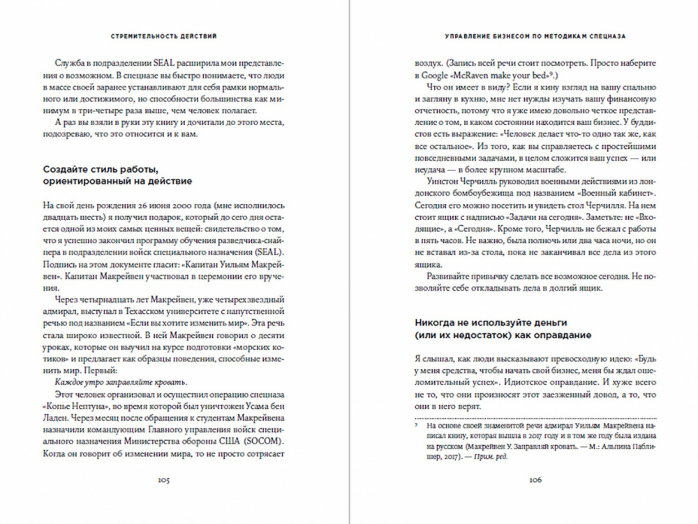Вас может удивить, что бывший снайпер подразделения «морских котиков» написал бизнес-книгу. Но в этом нет ничего странного. Бойцы отрядов особого назначения обладают навыками, которые, во-первых, помогают им успешно справляться с заданием, а во-вторых, чрезвычайно эффективны не только на войне, но и в бизнесе. Спецназовцев безжалостно тренируют, чтобы они научились приспосабливаться, могли решать проблемы нестандартно и при любых обстоятельствах. Брэндон Уэбб успешно применил опыт, полученный за время службы в ВМС США, когда создавал собственную медиасеть Hurricane Group, Inc. В своей книге он рассказывает об уроках, которые получил за время военной службы и которые помогут любому предпринимателю стать «спецназовцем от бизнеса».