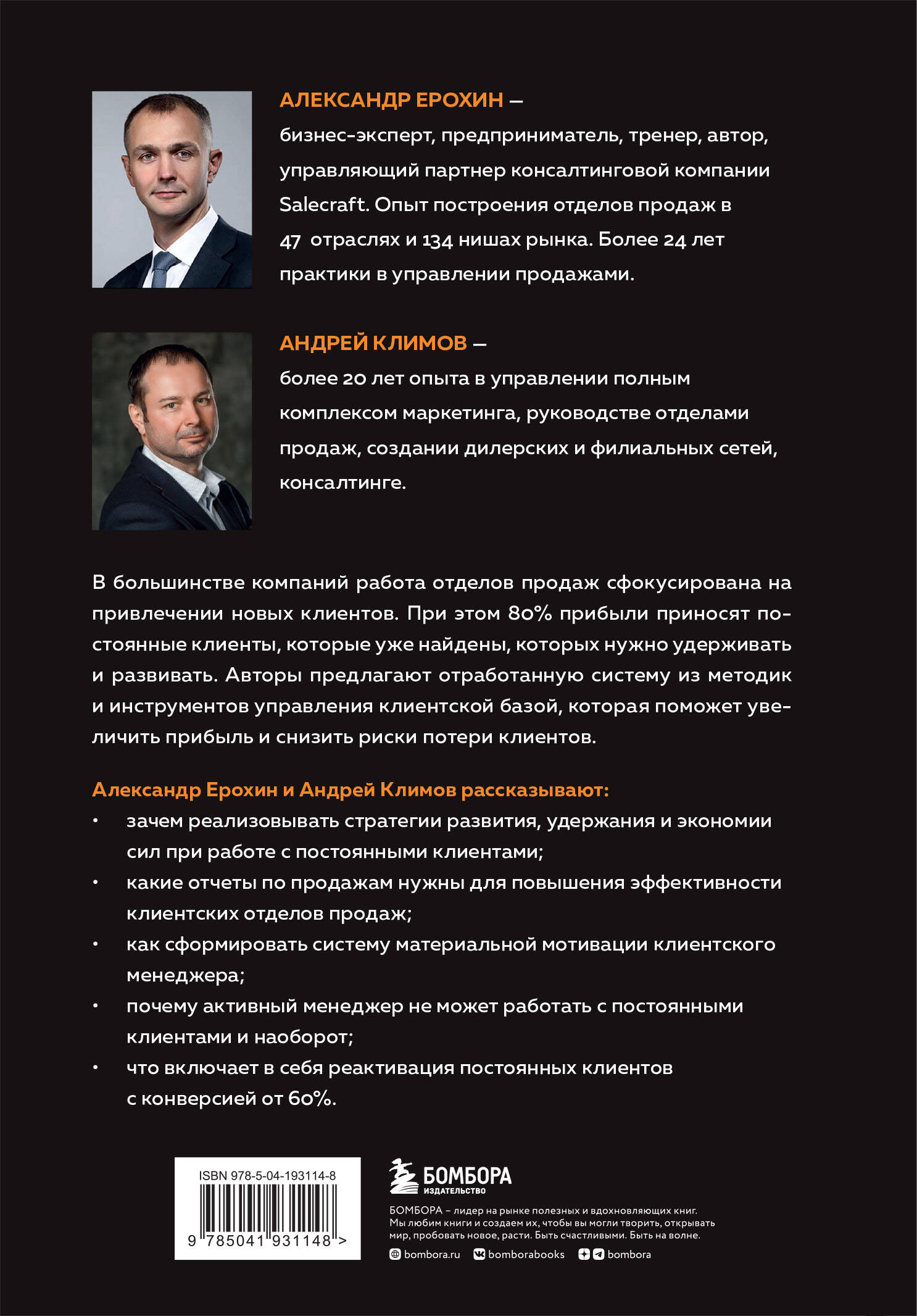 Александр Ерохин - бизнес-эксперт, предприниматель, тренер, автор, управляющий партнер консалтинговой компании Salecraft. Опыт построения отделов продаж в 47 отраслях и 134 нишах рынка. Более 24 лет практики в управлении продажами. Андрей Климов - более 20 лет опыта в управлении полным комплексом маркетинга, руководстве отделами продаж, создании дилерских и филиальных сетей, консалтинге. В большинстве компаний работа отделов продаж сфокусирована на привлечении новых клиентов. При этом 80% прибыли приносят постоянные клиенты, которые уже найдены, которых нужно удерживать и развивать. Авторы предлагают отработанную систему из методик и инструментов управления клиентской базой, которая поможет увеличить прибыль и снизить риски потери клиентов. Александр Ерохин и Андрей Климов рассказывают: - зачем реализовывать стратегии развития, удержания и экономии сил при работе с постоянными клиентами; - какие отчеты по продажам нужны для повышения эффективности клиентских отделов продаж; - как сформировать систему материальной мотивации клиентского менеджера; - почему активный менеджер не может работать с постоянными клиентами и наоборот; - что включает в себя реактивация постоянных клиентов с конверсией от 60%.| Издательство | ООО "Издательство "Эксмо" |