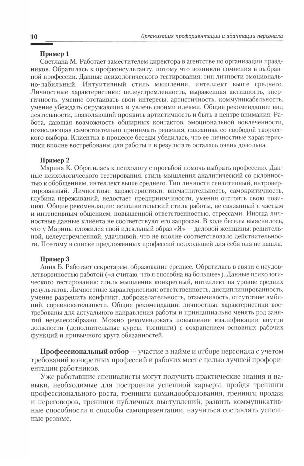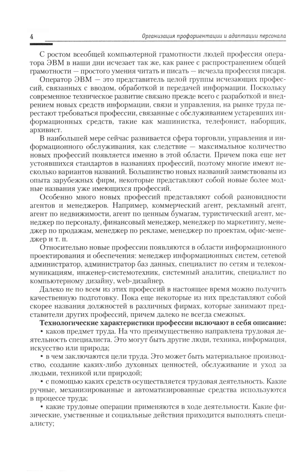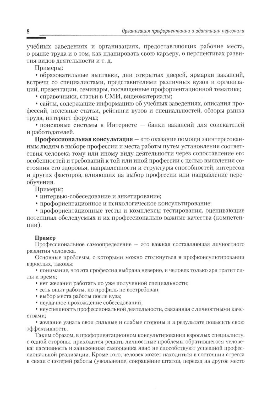 Рассматривается характеристика понятия «профессия», приводятся направления и практические меры по осуществлению профессиональной ориентации, позволяющие определить профессиональную направленность личности и способствующие выбору будущей профессии. Раскрывается содержание программы адаптации персонала в организации, рассматривается пошаговая технология реализации данной программы, приводятся практические примеры по осуществлению программы адаптации персонала в конкретных организациях. Приводятся документы, регламентирующие процессы профориентации и адаптации персонала.| Издательство | Блок-Принт |