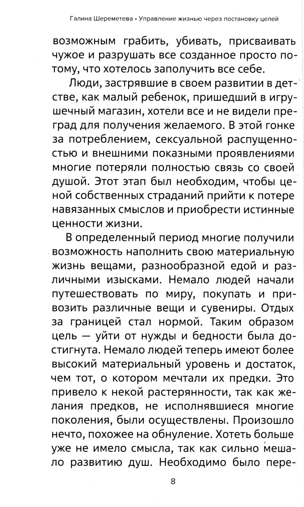 Эта книга о целях, которые строят жизнь человека. Найти свое место в жизни и определиться с истинными целями мечтают многие. К чему мы стремимся и почему? Как найти свои собственные цели, из которых построиться уникальный путь? Еще в детстве наше окружающие нас люди ставит перед нами цели, достигнув которых, по их мнению, мы станем счастливыми обеспеченными людьми. Много лет мы идем по намеченной дороге, которая не всегда приводит нас к счастью и благополучию. Тогда встает вопрос о том, как найти свою истинную дорогу и место в жизни. Эта книга поможет разобраться со своими целями и смыслом жизни. Автор, на основе многолетней работы с людьми, предлагает в этой книге несколько тем и вопросы по ним для индивидуального осмысления, а также разбирает причины возникающих трудностей и предлагает пути решения возникающих проблем.