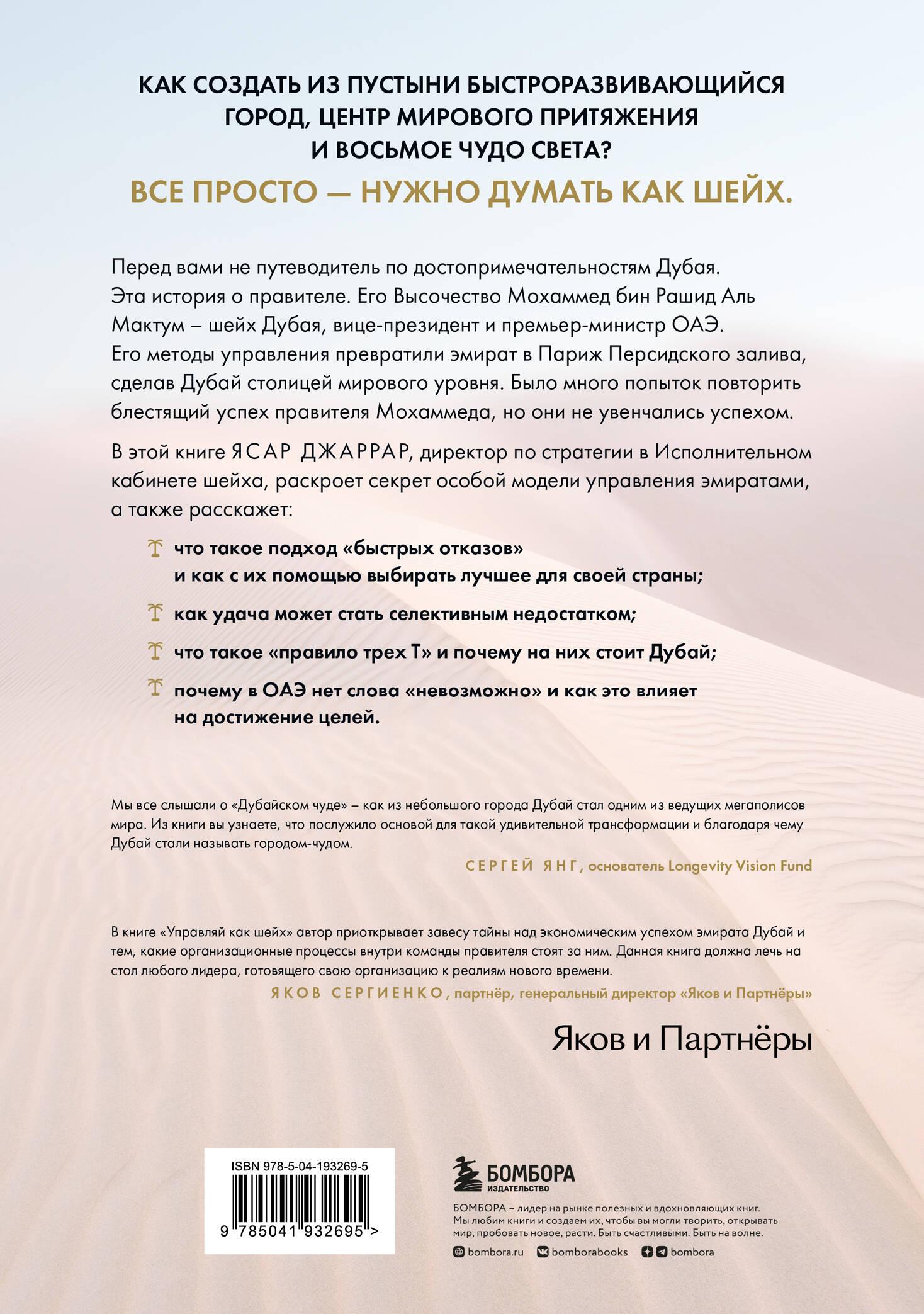 Как создать из пустыни быстроразвивающийся город, центр мирового притяжения и восьмое чудо света? Все просто - нужно думать, как шейх. Перед вами не путеводитель по достопримечательностям Дубая. Эта история о шейхе. Его Высочество шейх Мохаммед бин Рашид Аль Мактум - шейх Дубая, вице-президент и премьер министр ОАЭ. Его методы управления превратили эмират в Париж Персидского залива, сделав Дубай столицей мирового уровня. Было много попыток повторить блестящий успех правителя Мохаммеда, но они увенчались успехом. В этой книге Ясар Джаррар, директор по стратегии в Исполнительном кабинете Шейха, раскроет секрет особой модели управления эмиратами, а также расскажет: • Что такое подход «быстрых отказов» и как с их помощью выбирать лучшее для своей страны. • Как удача может стать селективным недостатком. • Что такое правило трех Т и почему на них стоит Дубай. • Почему в ОАЭ нет слова «невозможно» и как это влияет на достижение целей. Отзывы: Федор Овчинников - основатель и генеральный директор российской сети ресторанов быстрого питания «Додо Пицца»: «Дубай - пример настоящего экономического чуда. Это государство-стартап, которое смогло конвертировать нефтяные доходы в создание современного бизнес-центра, привлекающего инвесторов со всего мира. Мне всегда было интересно, как и почему у Дубая получилось превратить пустыню в ближневосточный Нью-Йорк? Книга шейха Моххамеда, архитектора развития Дубая, показывает, что в основе успеха лежат мудрые принципы и долгосрочное видение, амбициозные цели и большая мечта». Екатерина Ляхова - Директор по развитию бизнеса ГК «Росатом», Генеральный директор Управляющей компании «Группа Дело»: «Огромная часть успеха Дубая - это его ставка на становление логистическим сердцем Ближнего Востока. Учитывая наметившийся поворот мировой логистики в сторону глобального Юга и глобального Востока, уникальный рецепт построения транспортных хабов от автора книги будет полезен многим компаниям, стремящимся понять, как строить бизнес в новой реальности». Сергей Янг - Основатель, Longevity Vision Fund: «Мы все слышали о "Дубайском Чуде", когда из небольшого города Дубай стал одним из ведущих мегаполисов мира. Давайте, без излишней веры в чудеса, подробно разберемся, что же послужило основой такой удивительной трансформации. Верю, что понимание стратегии преобразования Дубая поможет каждому из нас на любом уровне и траектории развития - руководите ли вы городом, бизнесом или своей жизнью». Даниил Шулейко - директор бизнес-группы электронной торговли и логистических сервисов в «Яндекс»: «Дубай для многих - пример успеха и богатства. Но в эмирате в начале 2000-х почти полностью кончилась нефть, и его процветание обусловлено далеко не богатством недрами. Эта книга - не только рассказ об истории успеха, но и борьбы "за место под солнцем", когда кажется, что все вокруг против тебя». Яков Сергиенко - партнер, генеральный директор «Яков и партнеры»: «Быстрые перемены требуют решительных лидеров. При этом люди и хорошие идеи стали самыми ценными ресурсами любой организации. Но как провести грань между эффективностью и эмпатией, способностью принимать быстрые решения и действовать безошибочно? В книге "Управляй как Шейх" автор приоткрывает завесу тайны над экономическим успехом эмирата Дубай и тем, какие организационные про