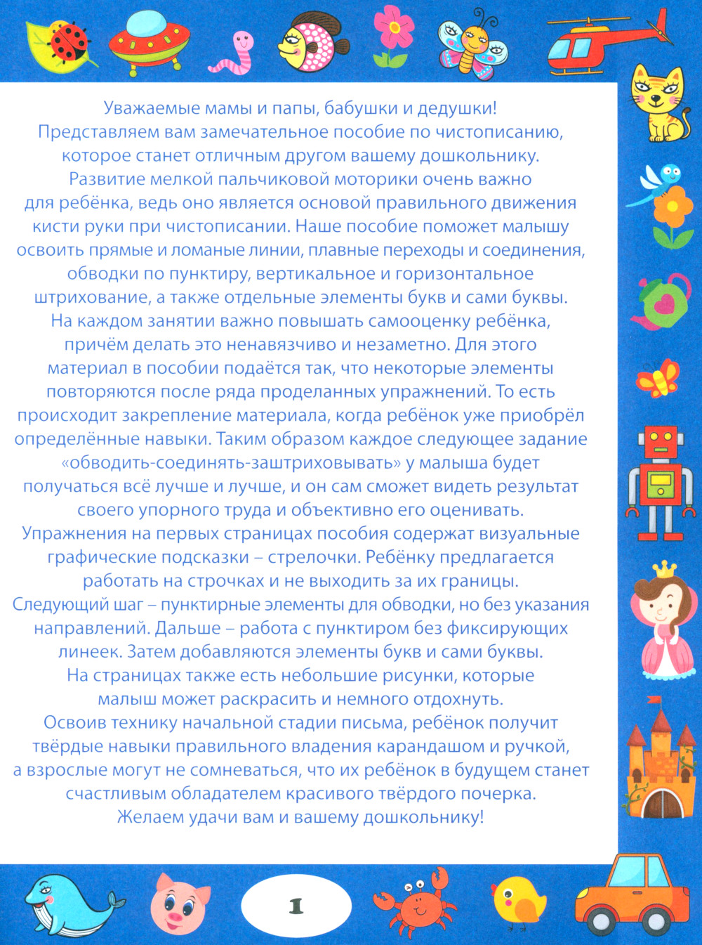 Уважаемые мамы и папы, бабушки и дедушки! Представляем вам замечательное пособие по чистописанию, которое станет отличным другом вашему дошкольнику. Развитие мелкой пальчиковой моторики очень важно для ребёнка, ведь оно является основой правильного движения кисти руки при чистописании. Наше пособие поможет малышу освоить прямые и ломаные линии, плавные переходы и соединения, обводки по пунктиру, вертикальное и горизонтальное штрихование, а также отдельные элементы букв и сами буквы. На каждом занятии важно повышать самооценку ребёнка, причём делать это ненавязчиво и незаметно. Для этого материал в пособии подаётся так, что некоторые элементы повторяются после ряда проделанных упражнений. То есть происходит закрепление материала, когда ребёнок уже приобрёл определённые навыки. Таким образом каждое следующее задание «обводить-соединять-заштриховывать» у малыша будет получаться всё лучше и лучше, и он сам сможет видеть результат своего упорного труда и объективно его оценивать. Упражнения на первых страницах пособия содержат визуальные графические подсказки - стрелочки. Ребёнку предлагается работать на строчках и не выходить за их границы. Следующий шаг - пунктирные элементы для обводки, но без указания направлений. Дальше - работа с пунктиром без фиксирующих линеек. Затем добавляются элементы букв и сами буквы. На страницах также есть небольшие рисунки, которые малыш может раскрасить и немного отдохнуть. Освоив технику начальной стадии письма, ребёнок получит твёрдые навыки правильного владения карандашом и ручкой, а взрослые могут не сомневаться, что их ребёнок в будущем станет счастливым обладателем красивого твёрдого почерка. Желаем удачи вам и вашему дошкольнику!