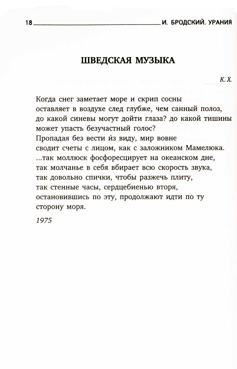 Сборники стихотворений Иосифа Бродского (1940-1996) «Остановка в пустыне», «Конец прекрасной эпохи», «Часть речи», «Новые стансы к Августе», «Урания» и «Пейзаж с наводнением» были опубликованы в 1970-90-е годы в американском издательстве «Ардис», где много лет выходили произведения русской литературы, которые не могли увидеть свет на родине. Бродский писал, что это издательство спасло многочисленных русских писателей и поэтов от забвения и изменило сам климат русской литературы. В сборник «Урания» вошли стихотворения 1970-1980-х годов, среди которых «Развивая Платона», «Осенний крик ястреба», «Венецианские строфы», «Римские элегии» и многие другие.| Издательство | Лениздат |