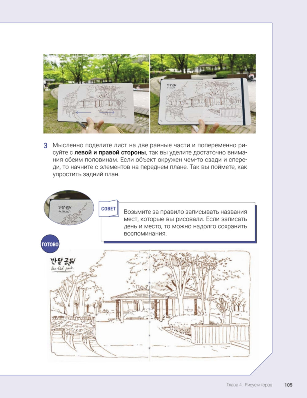 Руководство по городскому скетчингу от известного корейского художника, работавшего над промоматериалами к таким фильмам, как «Мстители» и «Красавица и чудовище». Старинный дом среди небоскребов, необычное дерево в парке, милый бариста в кофейне... Каждый наш день полон моментов, которые достойны быть запечатленными. Городской скетчинг - один из лучших способов взглянуть на будни с непривычного ракурса, а советы опытного художника и преподавателя помогут вам сделать первые шаги в новом хобби. Создайте свою коллекцию альбомов с воспоминаниями! Благодаря этой книге вы: • Узнаете все об инструментах для скетчинга и научитесь их выбирать. • Поймете, из каких этапов состоит работа над рисунками. • Сможете легко выстраивать перспективу и композицию, а также подбирать цвета и накладывать тени. • Станете внимательным наблюдателем, который видит красоту повседневной жизни.| Издательство | Питер |