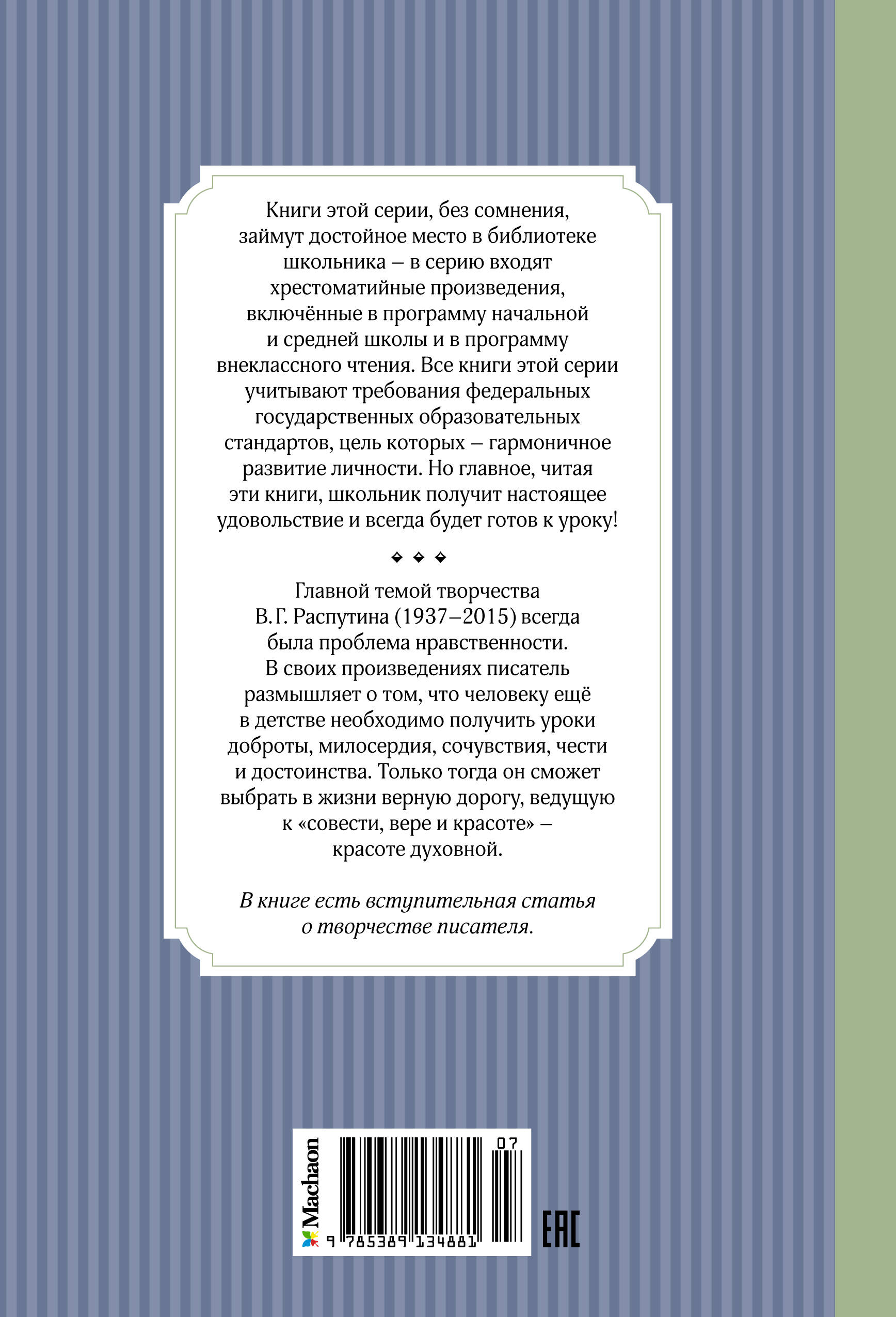 Валентин Распутин - классик русской и мировой литературы, наш современник. Свою жизненную позицию он формулирует так: "…защищать совесть, веру и красоту". Рассказы "Мама куда-то ушла", "Уроки французского" и "Век живи - век люби", которые входят в эту книгу, повествуют о трёх героях, мальчиках разного возраста, которые оказываются в непростых жизненных ситуациях. Какие уроки они вынесут для себя?| Издательство | Азбука-Аттикус Издат.группа ООО |