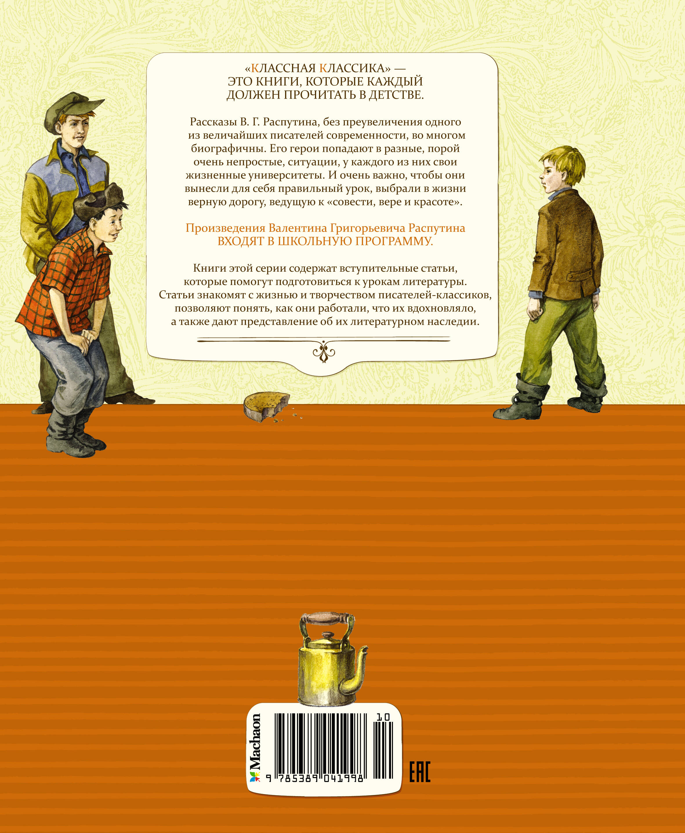 Рассказы В.Г. Распутина, без преувеличения одного из величайших писателей современности, во многом биографичны. Его герои попадают в разные, порой очень непростые, ситуации, у каждого из них свои жизненные университеты. И очень важно, чтобы они вынесли для себя правильный урок, выбрали в жизни верную дорогу, ведущую к "совести, вере и красоте". Произведения Валентина Григорьевича Распутина входят в школьную программу. Книги этой серии содержат вступительные статьи, которые помогут подготовиться к урокам литературы. Статьи знакомят с жизнью и творчеством писателей-классиков, позволяют понять, как они работали, что их вдохновляло, а также дают представление об их литературном наследии.| Издательство | Азбука-Аттикус Издат.группа ООО |