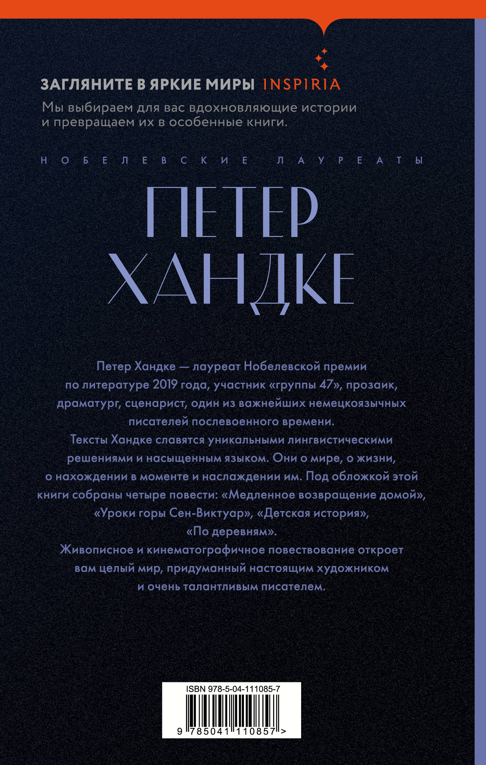 Петер Хандке - лауреат Нобелевской премии, яркий представитель немецкоязычной литературы, талантливый стилист, сценарист многих известных кинофильмов, в числе которых «Небо над Берлином» и «Страх вратаря перед пенальти». Тексты Хандке - это умиротворенное созерцание природной живописи, пейзажи, словно навеки застывшие в янтаре, и вечное стремление к прекрасному. Повести «Медленное возвращение домой», «Уроки горы Сен-Виктуар», «Детская история» и «По деревням», собранные под этой обложкой - настоящие жемчужины. Читайте в новой серии, собравшей самых лучших авторов нашего времени - «Нобелевская премия. Коллекция». *В книгах Inspiria, выпущенных в 2020 году, доступен к прослушиванию только пробный фрагмент аудио. В книгах, выпущенных позже 2020 года, мы предоставляем доступ к полной аудиоверсии.| Издательство | ООО "Издательство "Эксмо" |