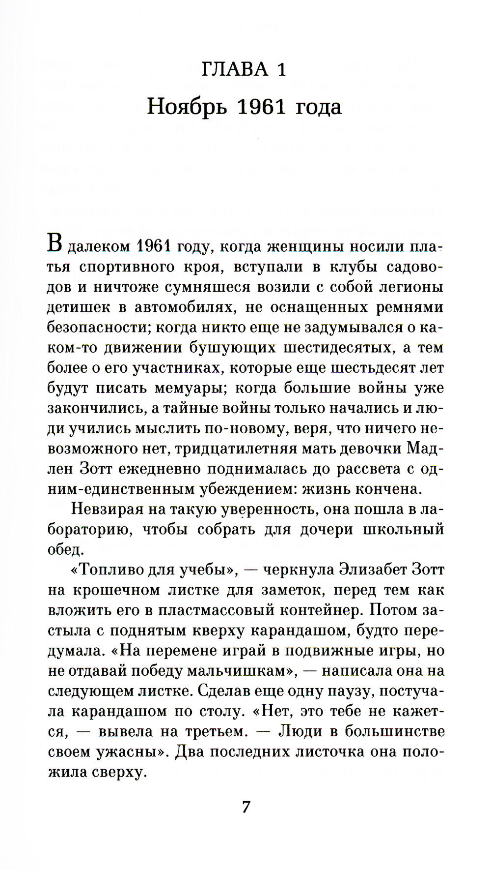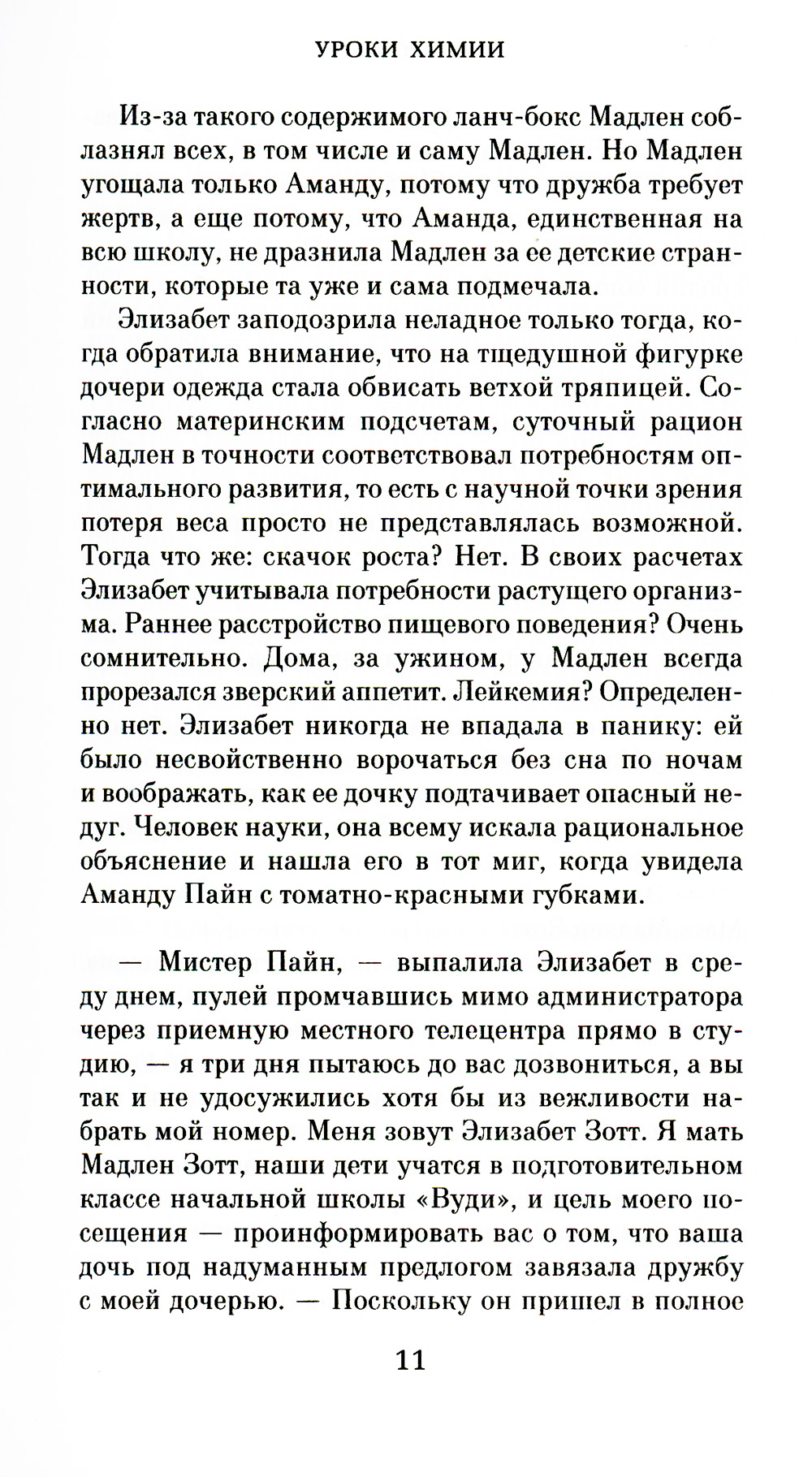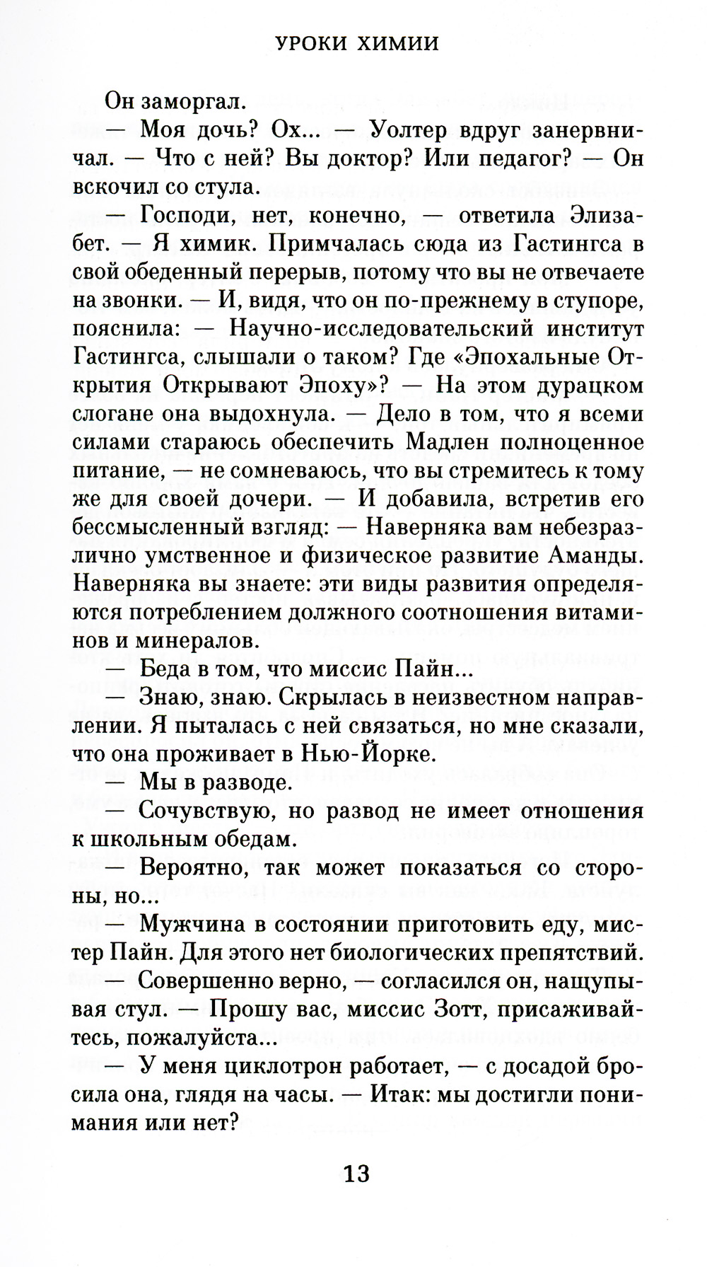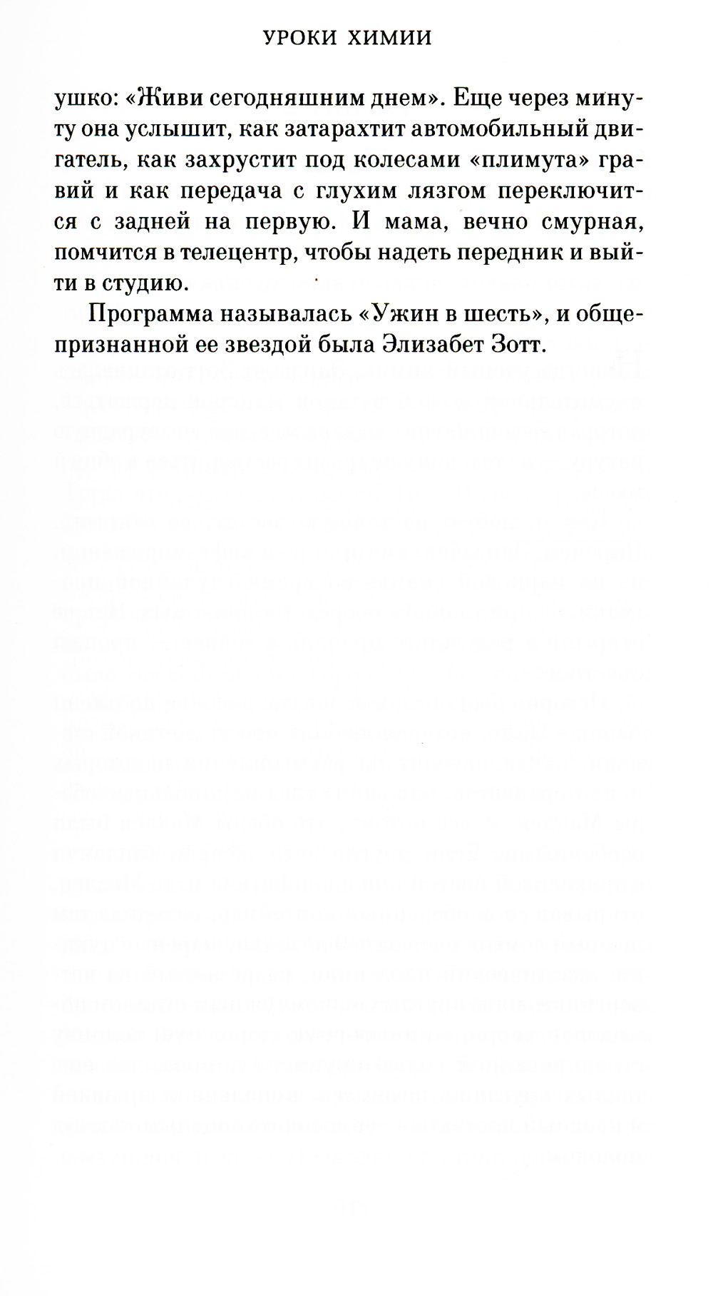 Все боятся Элизабет Зотт. Кто-то - ее ума, кто-то - остро заточенного карандаша, который она носит в прическе, а кто-то - четырнадцатидюймового ножа из ее сумочки (ведь каждый уважающий себя кулинар пользуется только своими собственными ножами). Причудливый зигзаг судьбы привел ее из Научно-исследовательского института Гастингса, где она мечтала заниматься абиогенезом (теорией возникновения жизни из неорганических веществ), на телевидение, где она ведет самую популярную в стране кулинарную передачу «Ужин в шесть». «Кулинария - это химия, - говорит она. - А химия - это жизнь. Она дает нам возможность изменить все, включая себя». Тем временем ее пятилетняя дочь Мадлен, растущая под присмотром минно-розыскного пса по кличке Шесть-Тридцать, пытается найти в школьной библиотеке Набокова и Нормана Мейлера, а также выстроить родословное древо, на котором должно найтись место и без пяти минут нобелевскому лауреату по химии Кальвину Эвансу, и фее-крестной, и деду в полосатой тюремной робе, и бабке, укрывшейся от налоговой полиции в Бразилии... Впервые на русском!