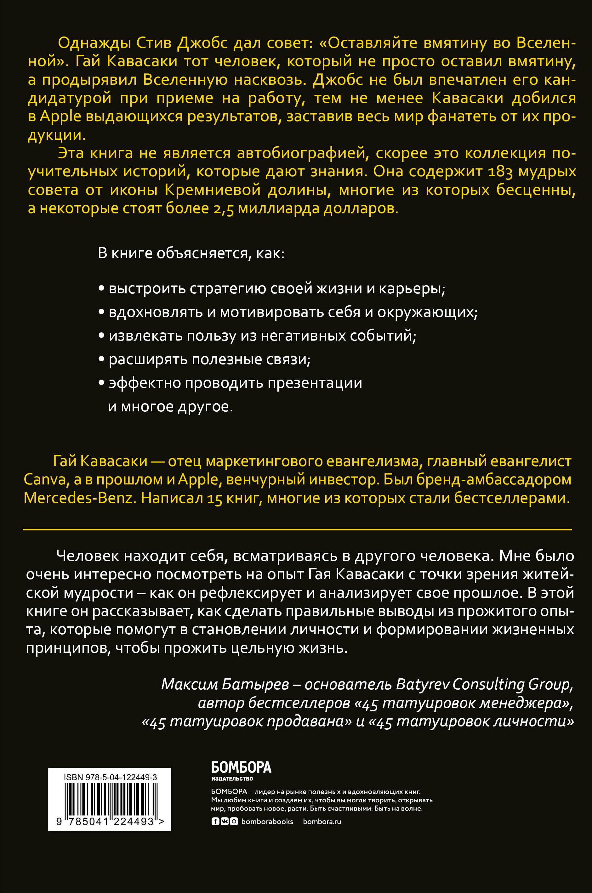 Однажды Стив Джобс дал совет: «Оставляйте вмятину во Вселенной». Гай Кавасаки тот человек, который не просто оставил вмятину, а продырявил Вселенную насквозь. Джобс не был впечатлен его кандидатурой при приеме на работу, тем не менее Кавасаки добился в Apple выдающихся результатов, заставив весь мир фанатеть от их продукции. Эта книга не является автобиографией, скорее это коллекция поучительных историй, которые дают знания. Она содержит 183 мудрых совета от иконы Кремниевой долины, многие из которых бесценны, а некоторые стоят более 2,5 миллиардов долларов. В книге объясняется как: • выстроить стратегию своей жизни и карьеры; • вдохновлять и мотивировать себя и окружающих; • извлекать пользу из негативных событий; • расширять полезные связи; • эффектно проводить презентации и многое другое. Гай Кавасаки - отец маркетингового евангелизма, главный евангелист Canva, а в прошлом и Apple, венчурный инвестор. Был бренд-амбассадором Mercedes-Benz. Написал 15 книг, многие из которых стали бестселлерами. «Человек находит себя, всматриваясь в другого человека. Мне было очень интересно посмотреть на опыт Гая Кавасаки с точки зрения житейской мудрости - как он рефлексирует и анализирует свое прошлое. В этой книге он рассказывает, как сделать правильные выводы из прожитого опыта, которые помогут в становлении личности и формировании жизненных принципов, чтобы прожить цельную жизнь.» Максим Батырев - основатель Batyrev Consulting Group, автор бестселлеров «45 татуировок менеджера», «45 татуировок продавана» и «45 татуировок личности»| Издательство | ООО "Издательство "Эксмо" |