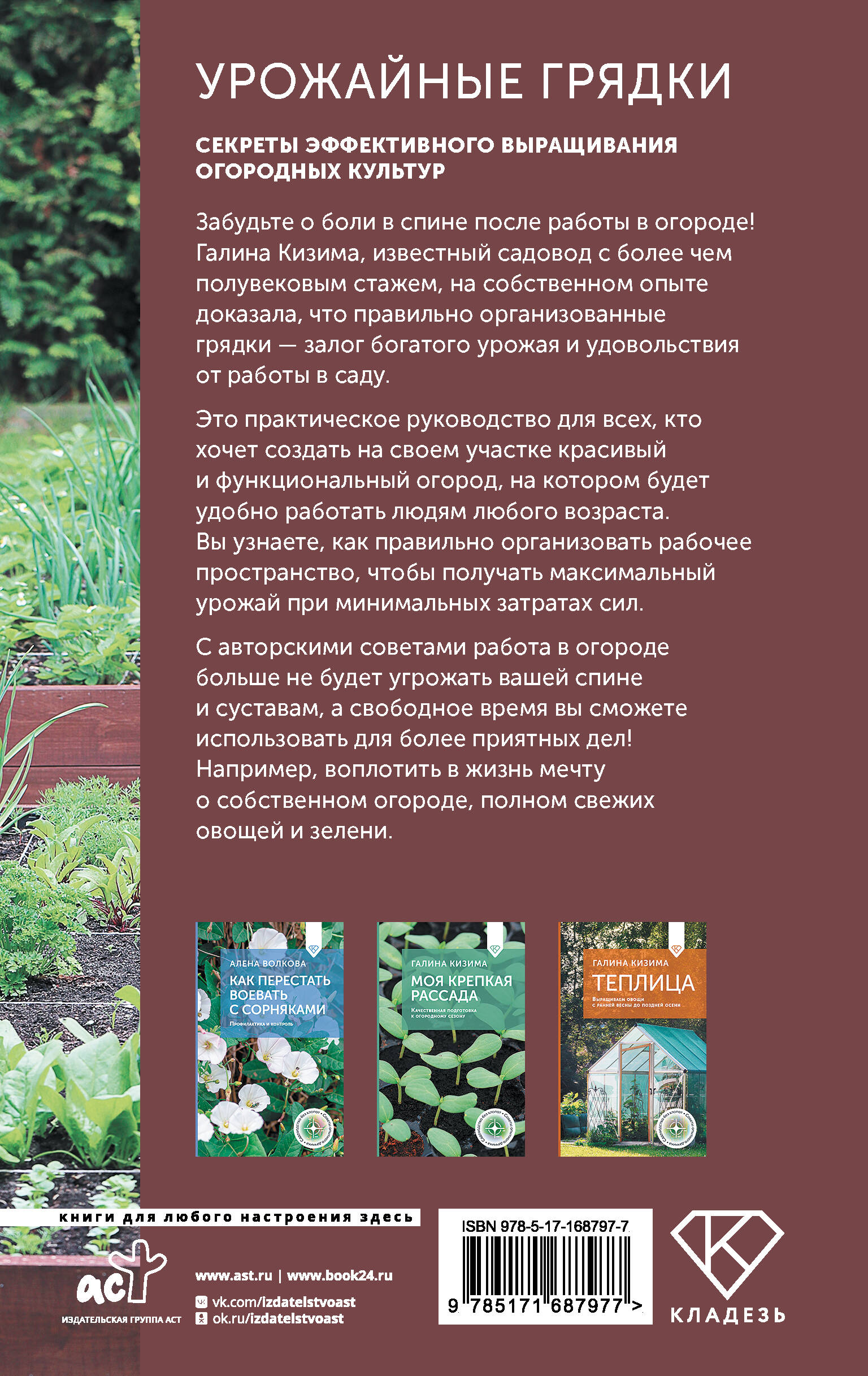 Забудьте о боли в спине после работы в огороде! Галина Кизима, известный садовод с более чем полувековым стажем, на собственном опыте доказала, что правильно организованные грядки - залог богатого урожая и удовольствия от работы в саду. Это практическое руководство для всех, кто хочет создать на своем участке красивый и функциональный огород, на котором будет удобно работать людям любого возраста. Вы узнаете, как правильно организовать рабочее пространство, чтобы получать максимальный урожай при минимальных затратах сил. С авторскими советами работа в огороде больше не будет угрожать вашей спине и суставам, а свободное время вы сможете использовать для более приятных дел! Например, воплотить в жизнь мечту о собственном огороде, полном свежих овощей и зелени.| Издательство | Издательство "АСТ" |
