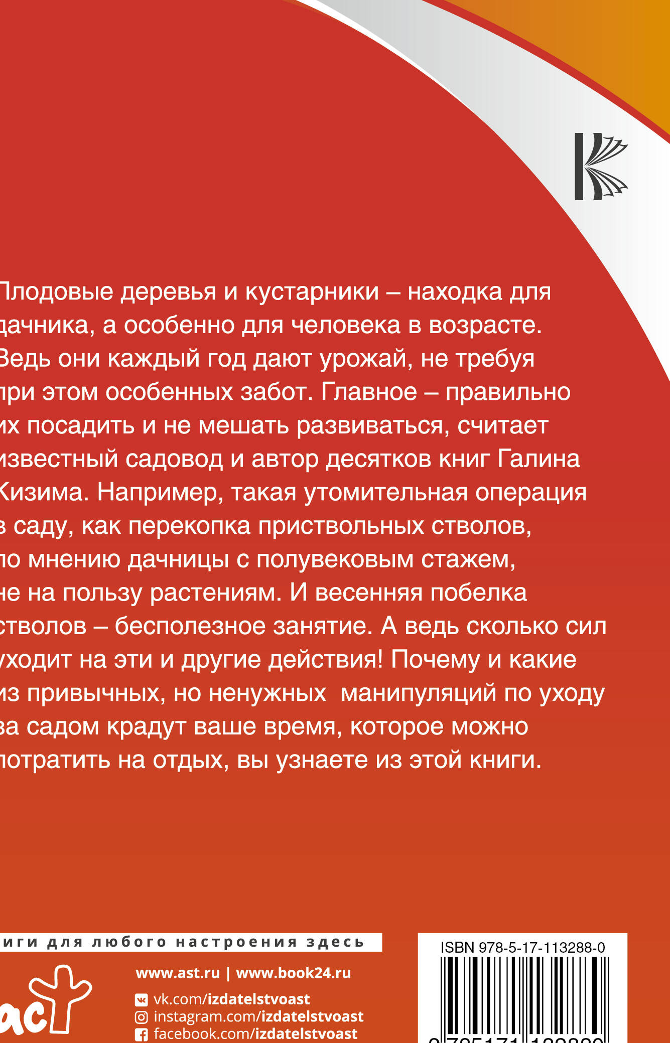 Серия «Возраст даче не помеха!» - находка для пенсионеров и тех, кто из-за пошатнувшегося здороровья вынужден отказываться от любимого хобби - выращивания овощей и фруктов. Как правильно посадить деревья и кустарники, чтобы потом годами собирать прекрасный урожай фруктов, не тратя на уход за растениями много и сил и времени. рассказывает замечательный автор Галина Кизима - непререкаемый авторитет для сотен тысяч дачников.| Издательство | ИЗДАТЕЛЬСТВО "АСТ" |