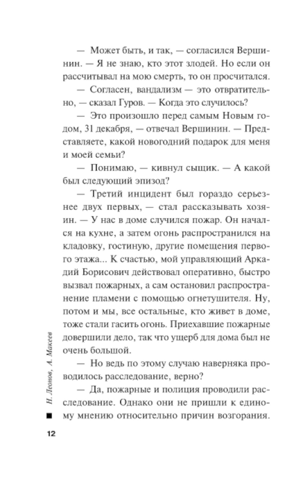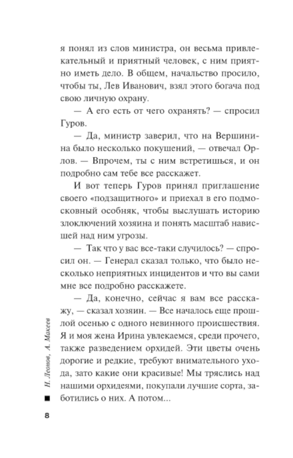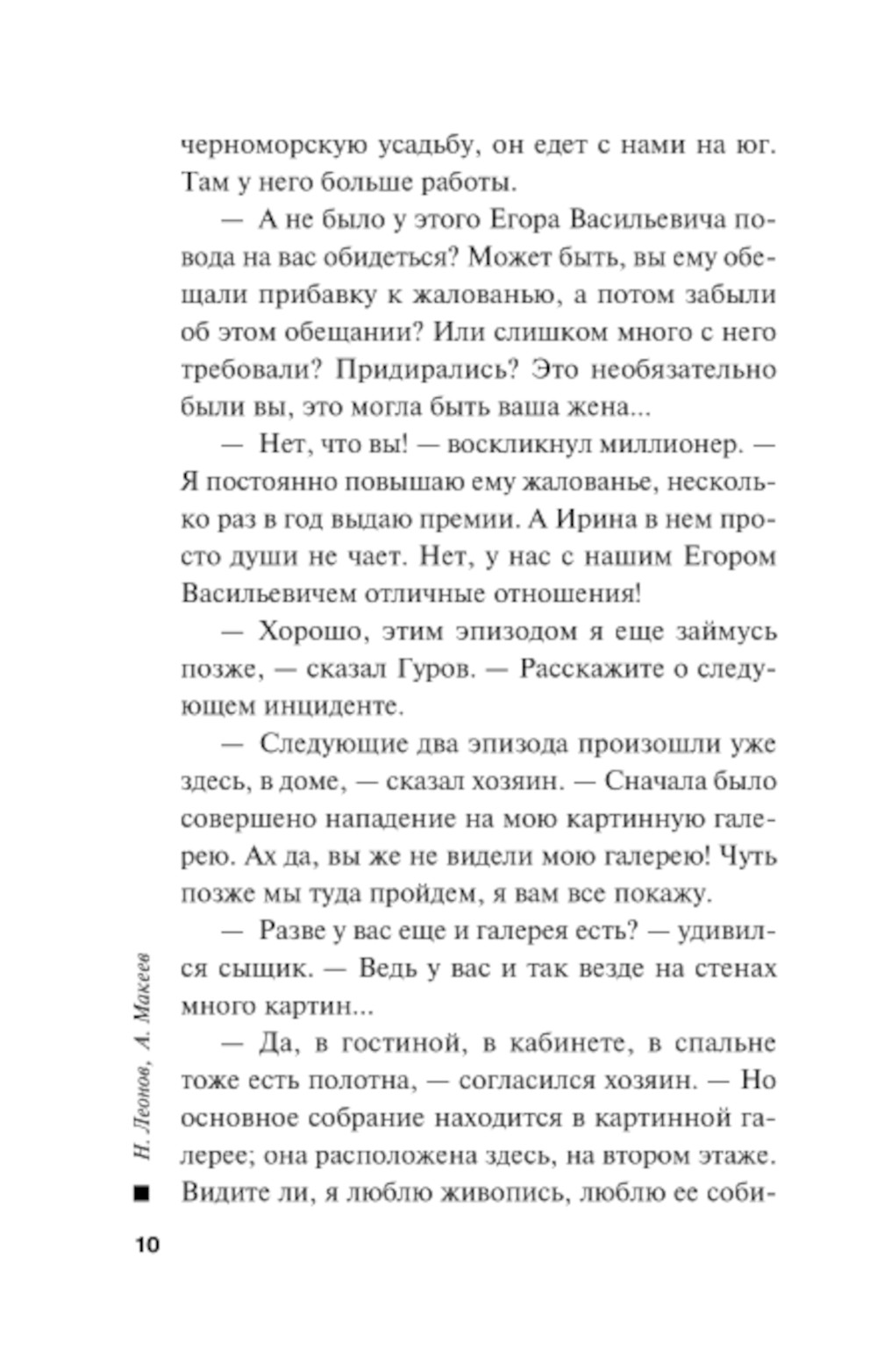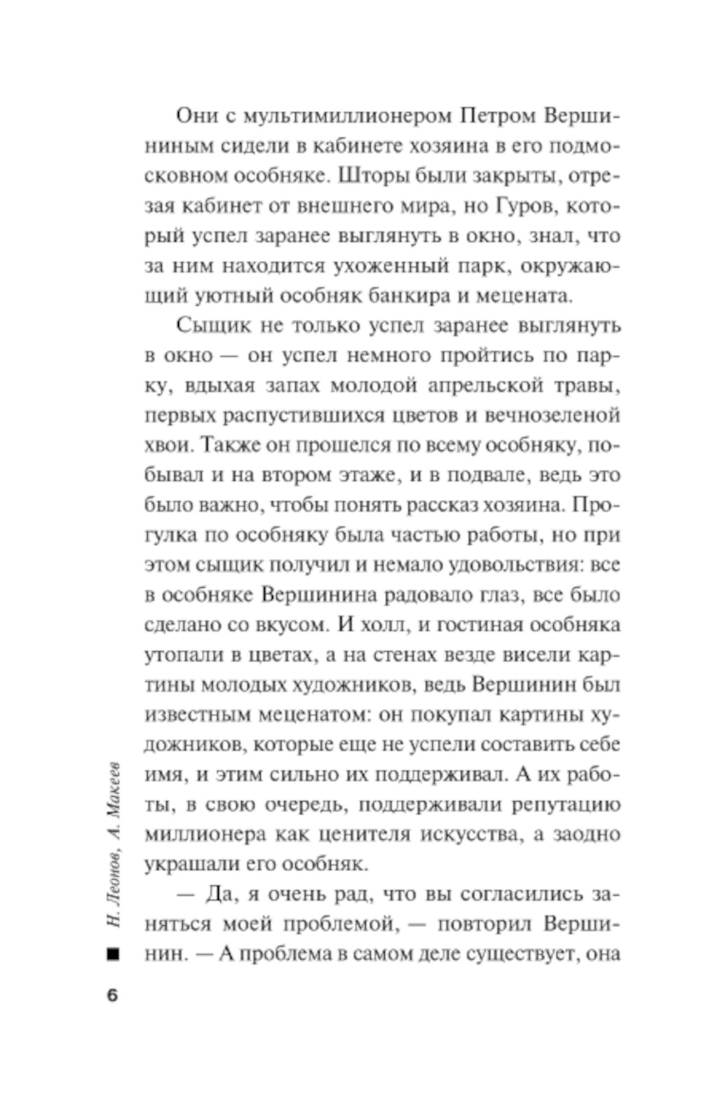 Легендарный детективный тандем Леонов - Макеев. Миллионер Петр Вершинин удачлив во всем: у него прибыльный бизнес, молодая красивая жена, надежные друзья, редкая картинная галерея в собственном особняке под Сочи. Неожиданно для миллионера наступает черная полоса. В усадьбе случается пожар, гибнет часть коллекции, неизвестный стреляет в окно дома, покушаясь на жену бизнесмена. Вершинин предлагает полковнику МВД Гурову пожить у него и помочь вычислить злодея. Гуров подозревает всех, кто живет в доме: художников, бизнесмена - друга Вершинина, охранников, жену миллионера, его сына и дочь... Однако прямых улик у сыщика нет. Все меняется, когда однажды на прогулке Гуров едва не погибает в подстроенной ловушке... Николай Леонов, в прошлом следователь МУРа, не понаслышке знал, как раскрываются самые запутанные уголовные дела. Поэтому каждая его книга - это правдивая захватывающая история с непредсказуемой интригой и неожиданным финалом. Главный герой этих книг, полковник Лев Гуров - сыщик высокого класса, к тому же с массой положительных человеческих качеств. Его уважают друзья, боятся враги и любят женщины. Он - настоящий отечественный супермен. Романы о Льве Гурове вот уже сорок лет неизменно привлекают поклонников отечественного детектива. Ставшая классической серия «Черная кошка» насчитывает более 200 книг, вышедших тиражом в десятки миллионов экземпляров.| Издательство | Эксмо |