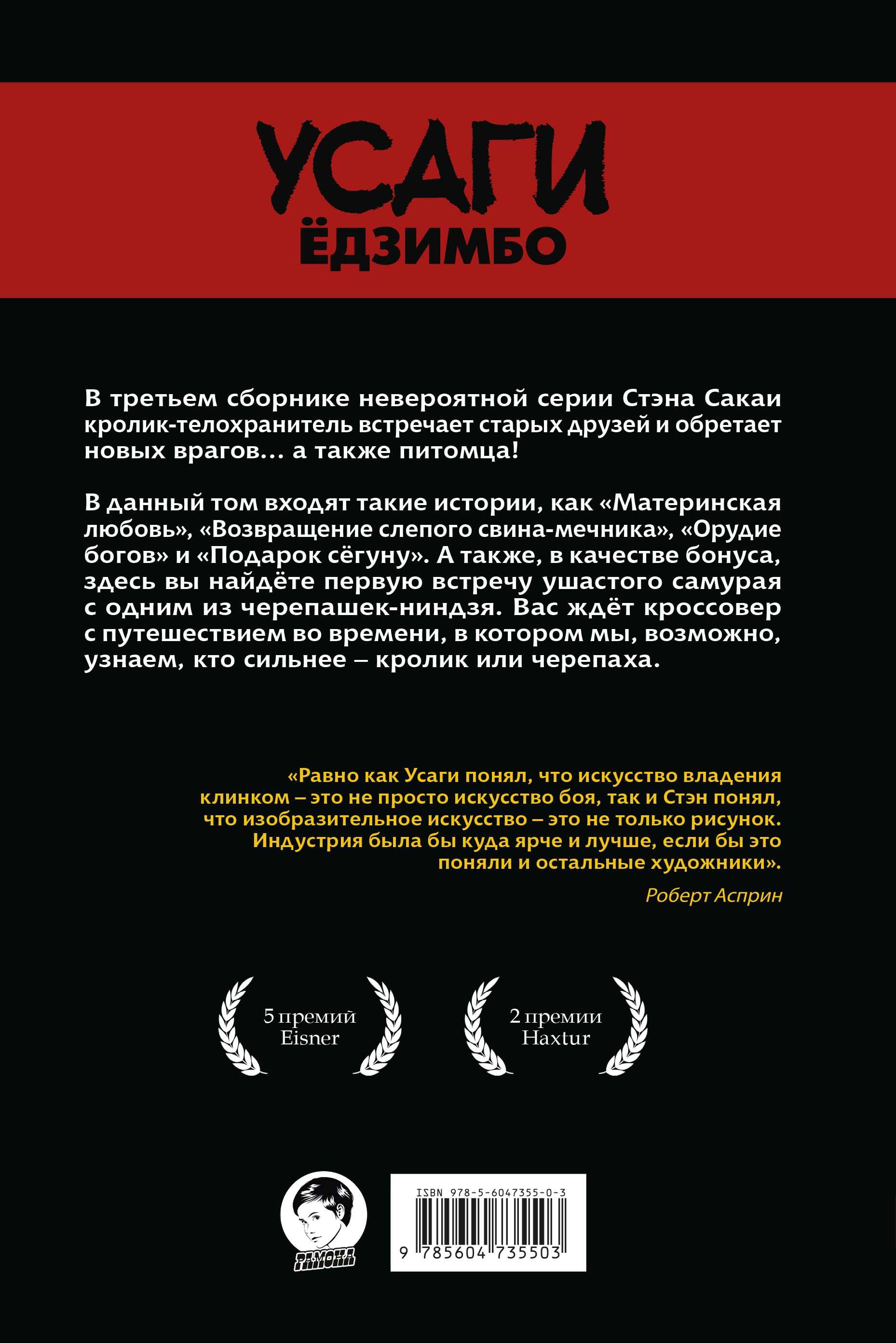 В третьем сборнике невероятной серии Стэна Сакаи кролик-телохранитель встречает старых друзей и обретает новых врагов… а также питомца! В данный том входят такие истории, как Материнская любовь, Возвращение слепого свина-мечника, Орудие богов и Подарок сёгуну. А также, в качестве бонуса, здесь вы найдёте первую встречу ушастого самурая с одним из черепашек-ниндзя. Вас ждёт кроссовер с путешествием во времени, в котором мы, возможно, узнаем, кто сильнее - кролик или черепаха.| Издательство | Эксмо |