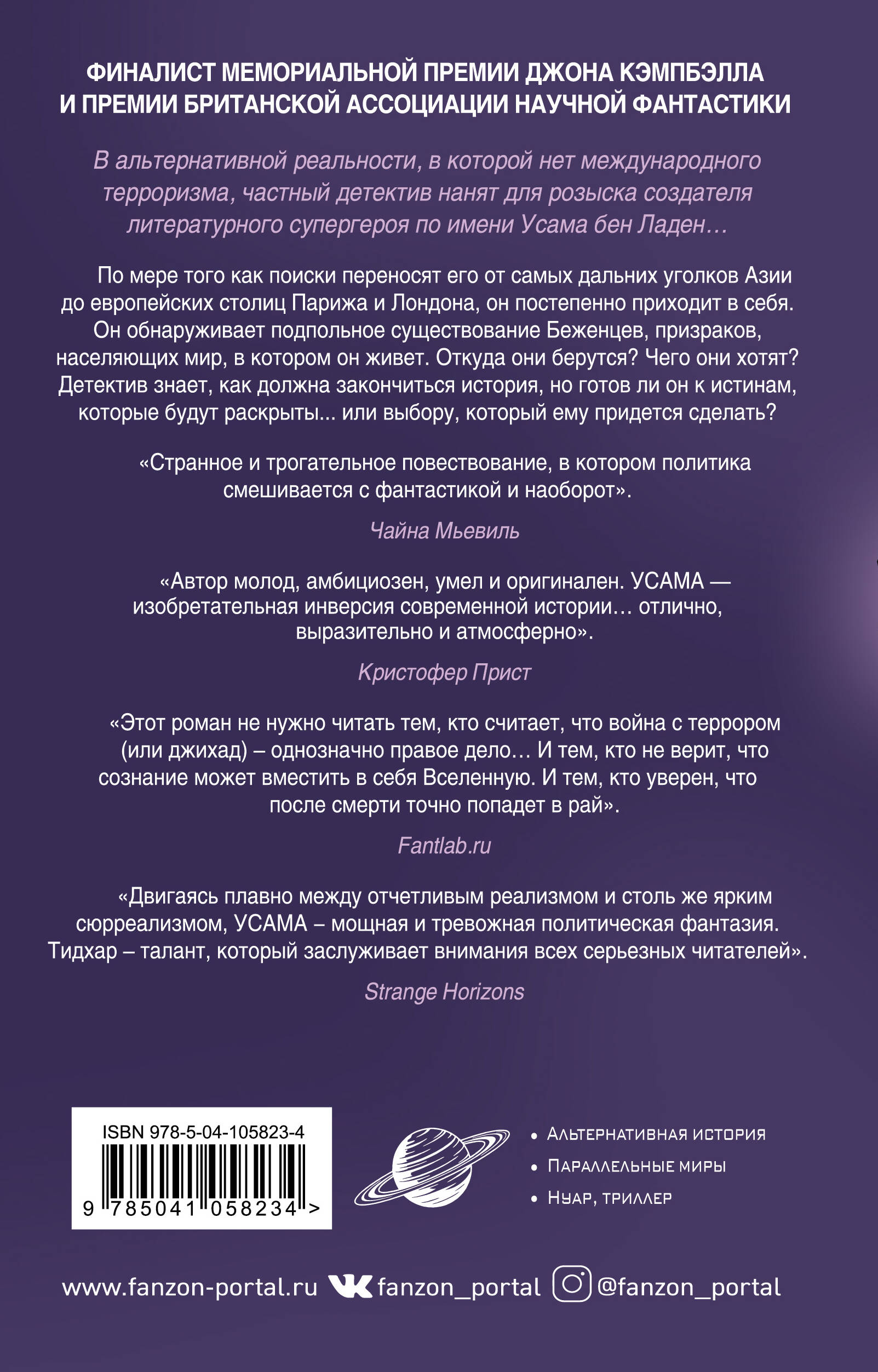 Всемирная премия фэнтези. Финалист Мемориальной премии Джона Кэмпбэлла и Премии Британской Ассоциации Научной Фантастики. В альтернативной реальности, в которой нет международного терроризма, частный детектив нанят для розыска создателя литературного супергероя по имени «Усама бен Ладен»… По мере того, как поиски переносят его от самых дальних уголков Азии до европейских столиц Парижа и Лондона, он постепенно приходит в себя. Он обнаруживает подпольное существование Беженцев, призраков, населяющих мир, в котором он живет. Откуда они берутся? Чего они хотят? Детектив знает, как должна закончиться история, но готов ли он к истинам, которые будут раскрыты... или выбору, который ему придется сделать? «Странное и трогательное повествование, в котором политика смешивается с фантастикой и наоборот». - Чайна Мьевиль «"Человек в Высоком замке" XXI века». - The Guardian «Автор молод, амбициозен, умел и оригинален. "УСАМА" - изобретательная инверсия современной истории… отлично, выразительно и атмосферно». - Кристофер Прист «Этот роман не нужно читать тем, кто считает, что война с террором (или джихад) - однозначно правое дело… И тем, кто не верит, что сознание может вместить себя Вселенную. И тем, кто уверен, что после смерти точно попадёт в рай». - Fantlab.ru «Двигаясь плавно между отчетливым реализмом и столь же ярким сюрреализмом, "УСАМА" - мощная и тревожная политическая фантазия. Тидхар - талант, который заслуживает внимания всех серьезных читателей». - Strange Horizons