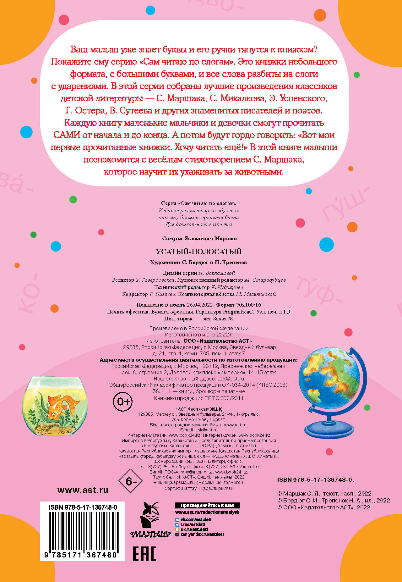 Крупный шрифт, разбивка на слоги, ударения, запоминающиеся цветные иллюстрации - в книгах серии "Сам читаю по слогам" есть всё необходимое для формирования у ребенка прочного навыка чтения и стимулирования устойчивого интеререса к книге. А еще это прекрасная возможность познакомиться с лучшими произвелениями любимых детских авторов, многие из которых стали неотъемлемой частью отечественной культуры. Знать их - признак образованного, культурного человека. Идеальное сочетание "цена-качество! Книги не будут обременительны для семейного бюджета и принесут массу пользы, создадут прекрасное настроение. Весёлое стихотворение С. Маршака "Усатый-полосатый" научит малышей бережному отношению к животным и заботе о них.| Издательство | ИЗДАТЕЛЬСТВО "АСТ" |