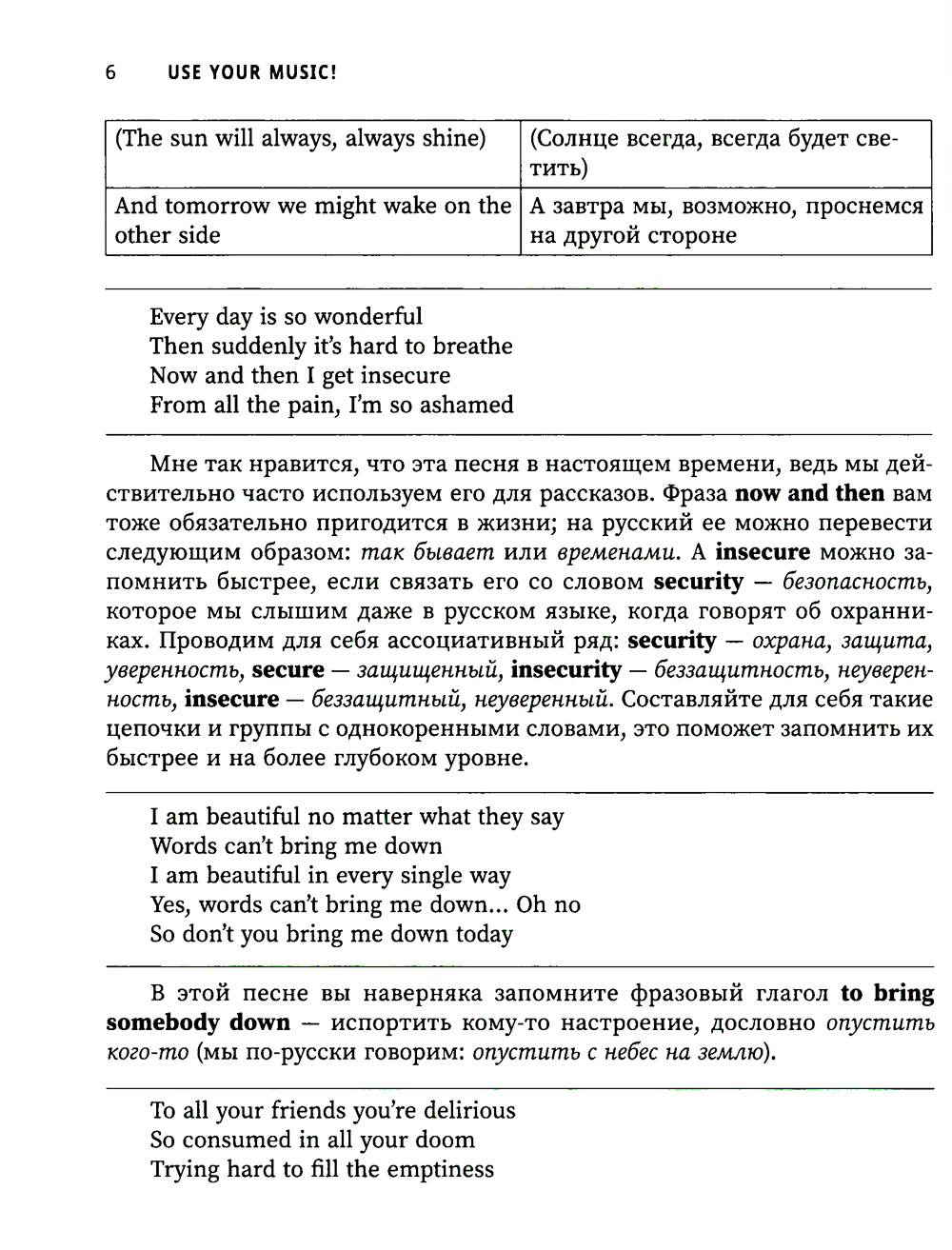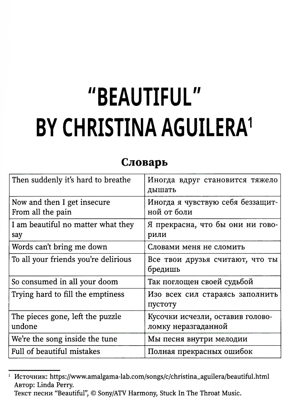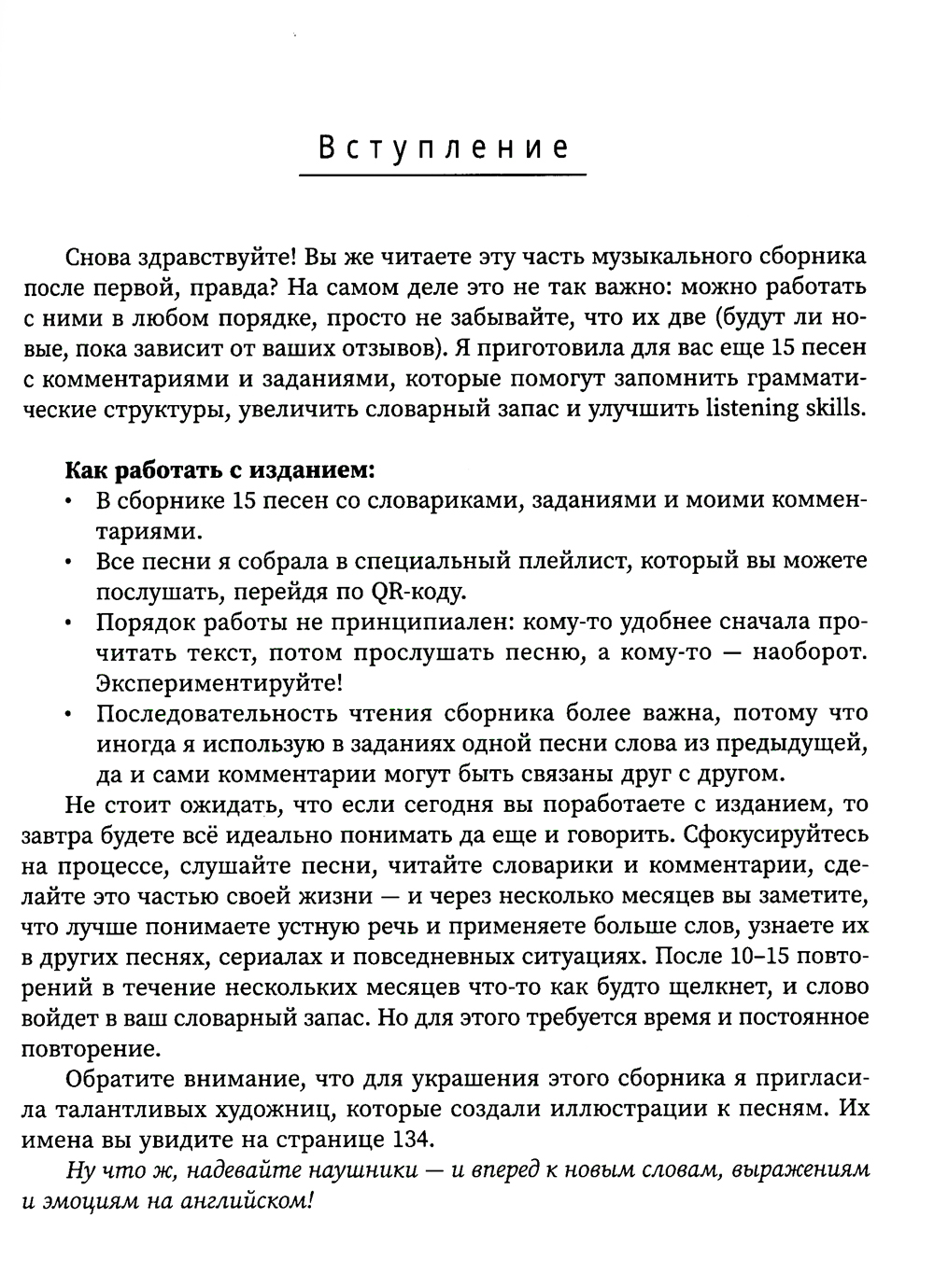 В этом издании вы найдете 15 песен на английском с комментариями преподавателя и заданиями, которые помогут вам запомнить грамматические структуры, увеличить словарный запас и улучшить listening skills.
