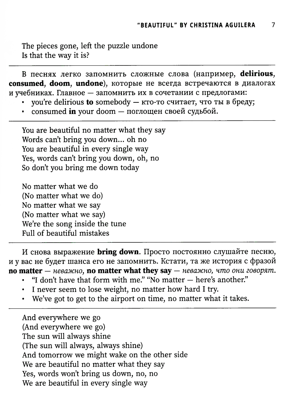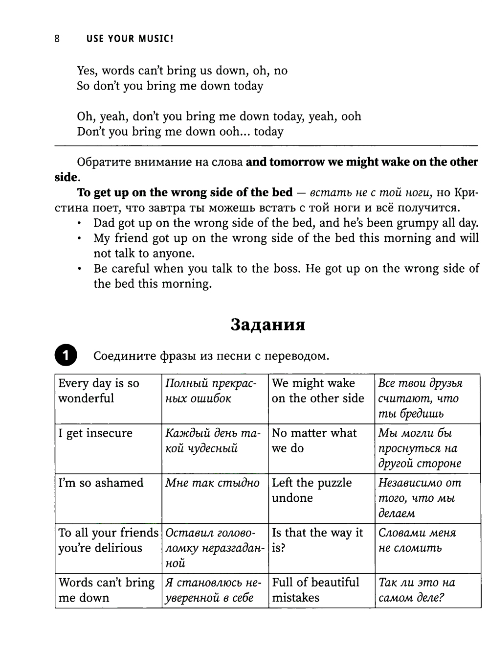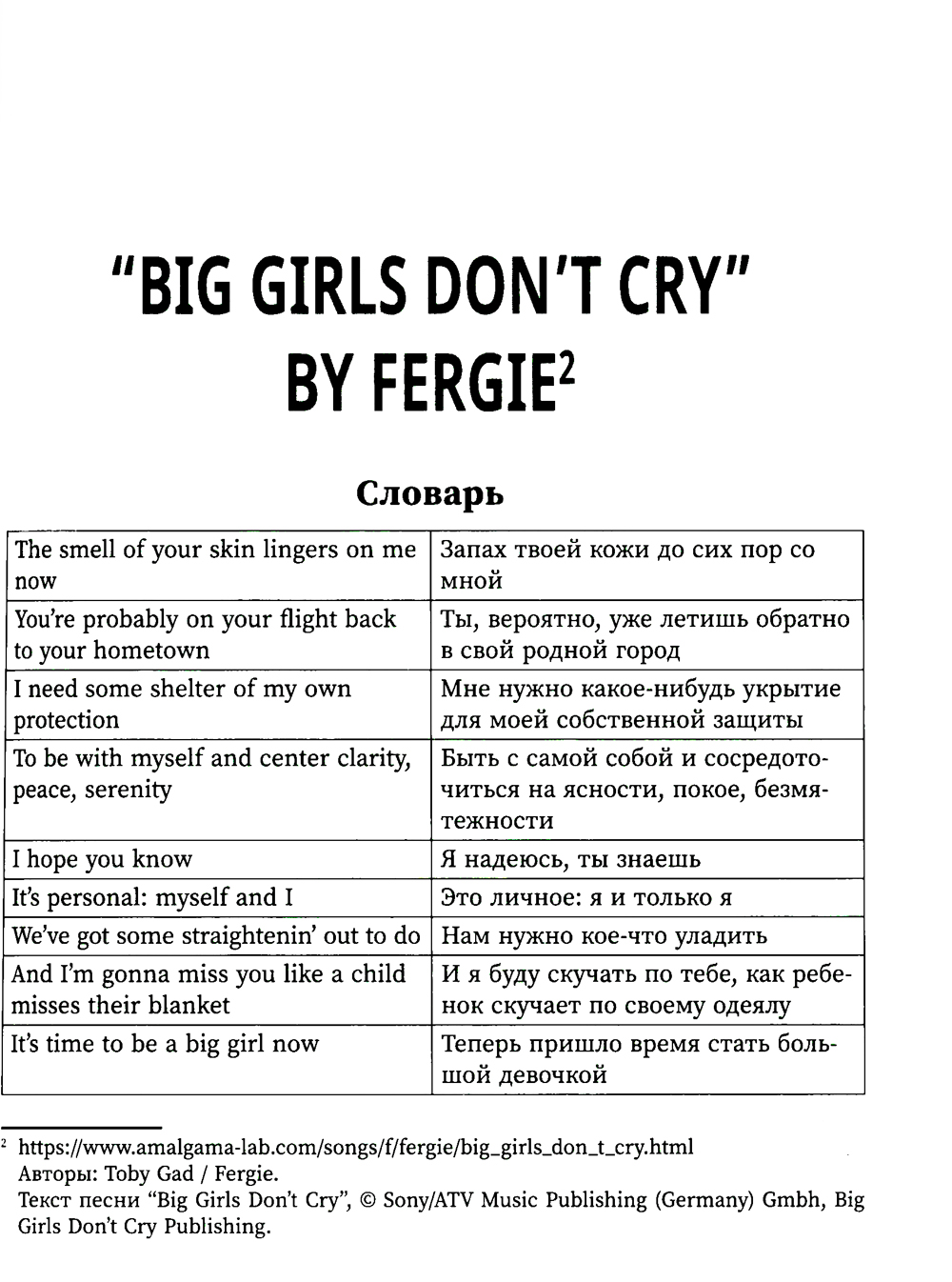В этом издании вы найдете 15 песен на английском с комментариями преподавателя и заданиями, которые помогут вам запомнить грамматические структуры, увеличить словарный запас и улучшить listening skills.