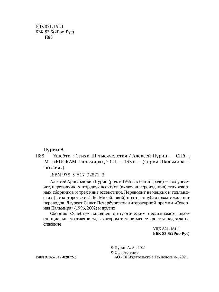 Алексей Арнольдович Пурин (род. в 1955 г. в Ленинграде) - поэт, эссеист, переводчик. Автор двух десятков (включая переиздания) стихотворных сборников и трех книг эссеистики. Переводит немецких и голландских (в соавторстве с И. М. Михайловой) поэтов, опубликовал семь книг переводов. Лауреат Санкт-Петербургской литературной премии «Северная Пальмира» (1996, 2002) и других. Сборник «Ушебти» наполнен онтологическим пессимизмом, экзистенциальным отчаянием, в котором тем не менее кроется надежда на спасение.| Издательство | Т8 RUGRAM |