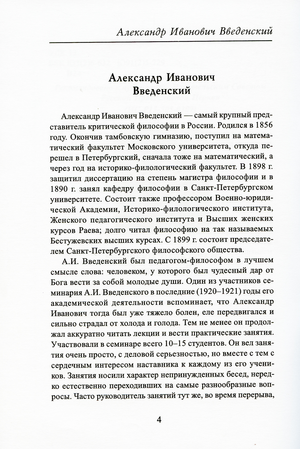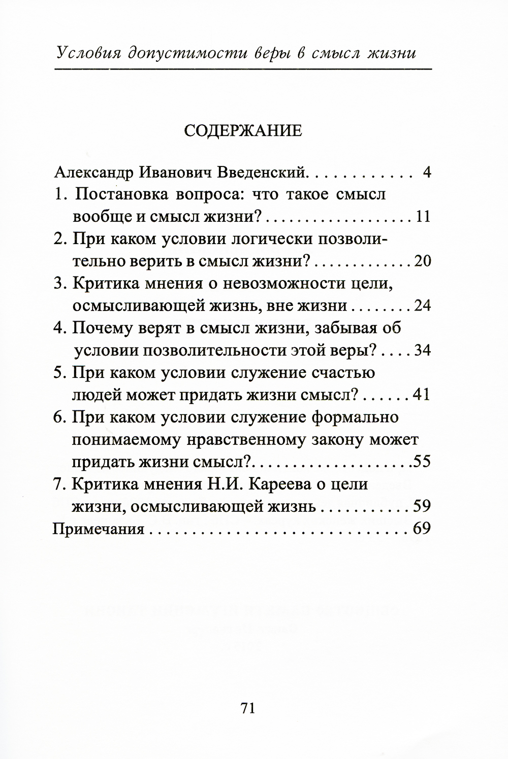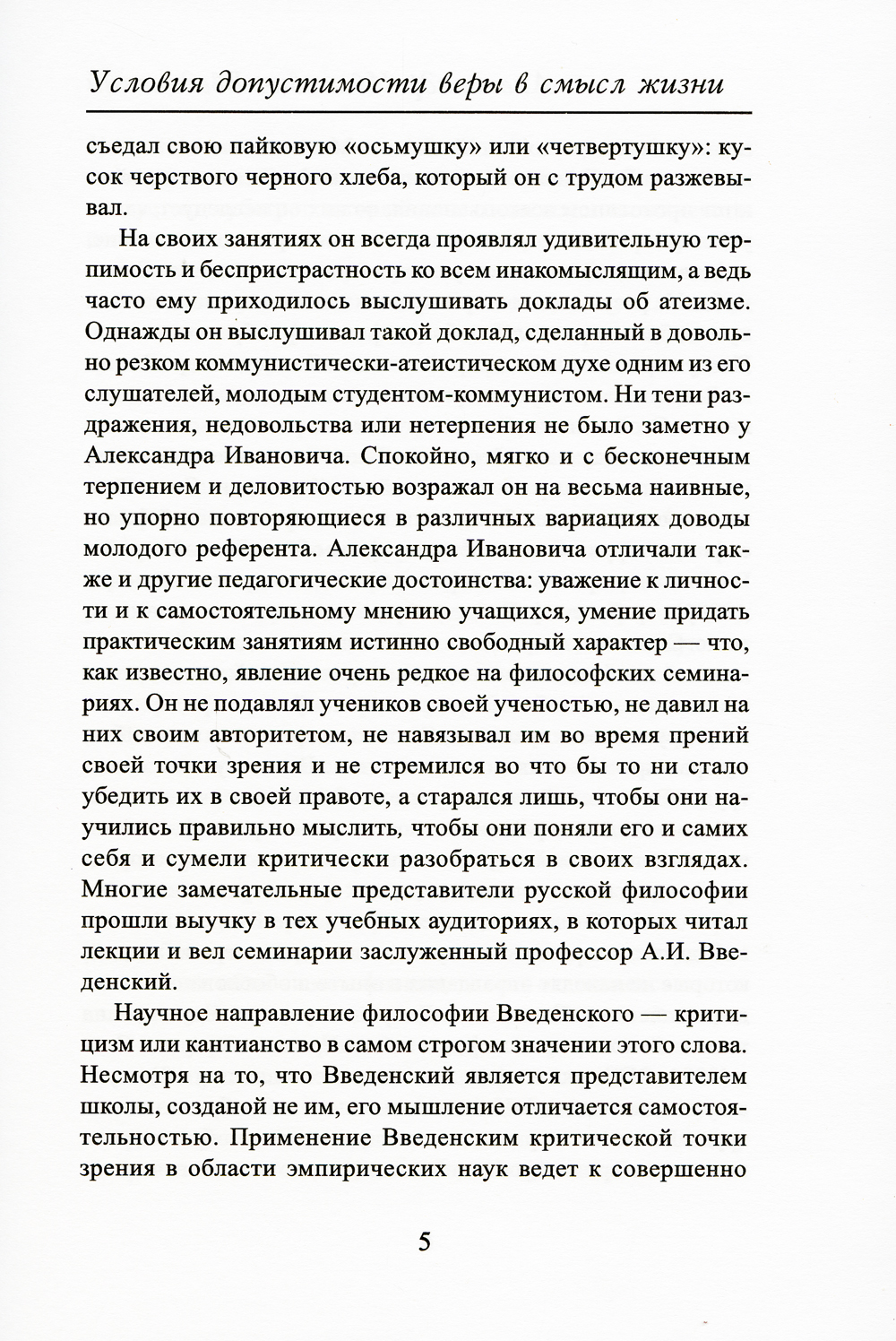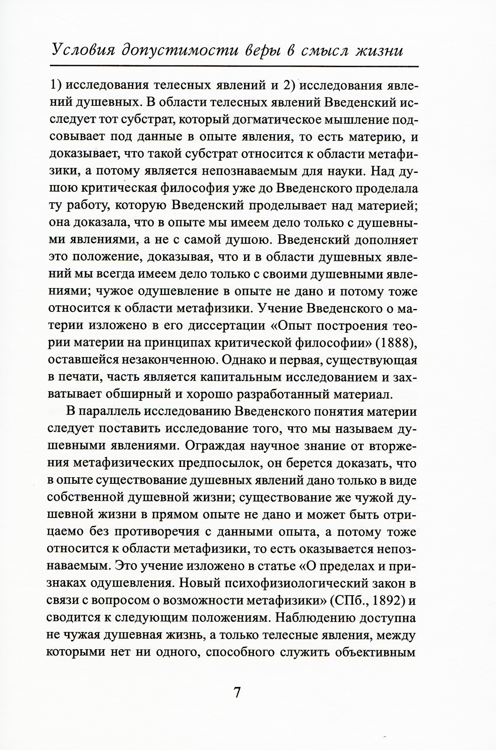 Эта работа впервые была опубликована в 1896 г. Введенский пишет: «Мы повсюду наталкиваемся на один и тот же вывод: или надо отказаться от веры в смысл жизни (а с ним и в смысл нравственного закона), или же, веря в него, надо верить и в личное бессмертие... Нравственное чувство, навязывающее нам признание обязательности нравственного долга, вместе с тем требует или, иначе, постулирует свободу воли, бессмертие души, существование Бога... Под влиянием недавнего господства материализма и полного упадка философии множество лиц отвыкло от веры в бессмертие, даже подсмеивается над ней, а в то же время толкует о смысле жизни, продолжает верить в него, и таким образом развращает свой ум, постепенно приучая его к крайней непоследовательности, к нелогичности, и этим самым вообще притупляет в нем способность чувствовать правду». Как видим, мысли, высказанные русским философом в конце XIX века, чрезвычайно актуальны и для дня сегодняшнего.| Издательство | Общество памяти игумении Таисии |