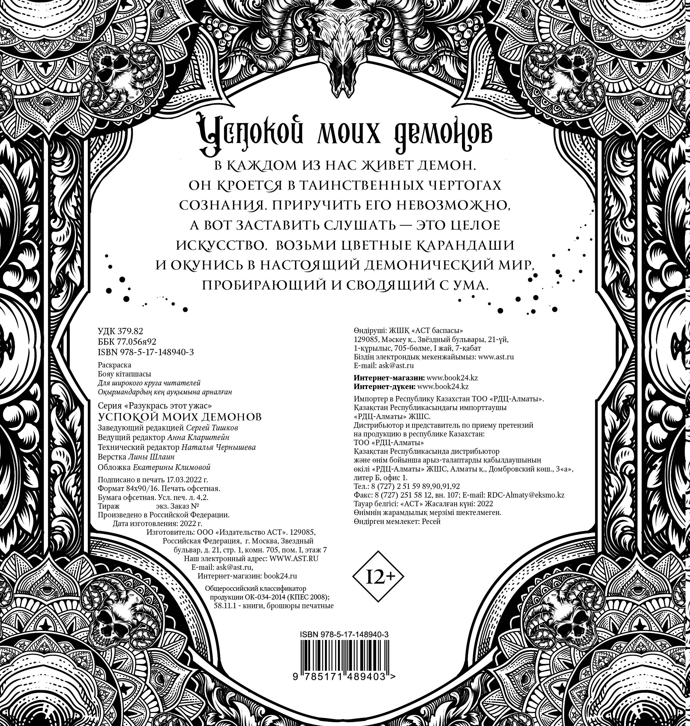 В каждом из нас живет демон. Он кроется в таинственных чертогах сознания. Приручить его невозможно, а вот заставить слушать - это целое искусство. Возьми цветные карандаши и окунись в настоящий демонический мир, пробирающий и сводящий с ума.| Издательство | АСТ |