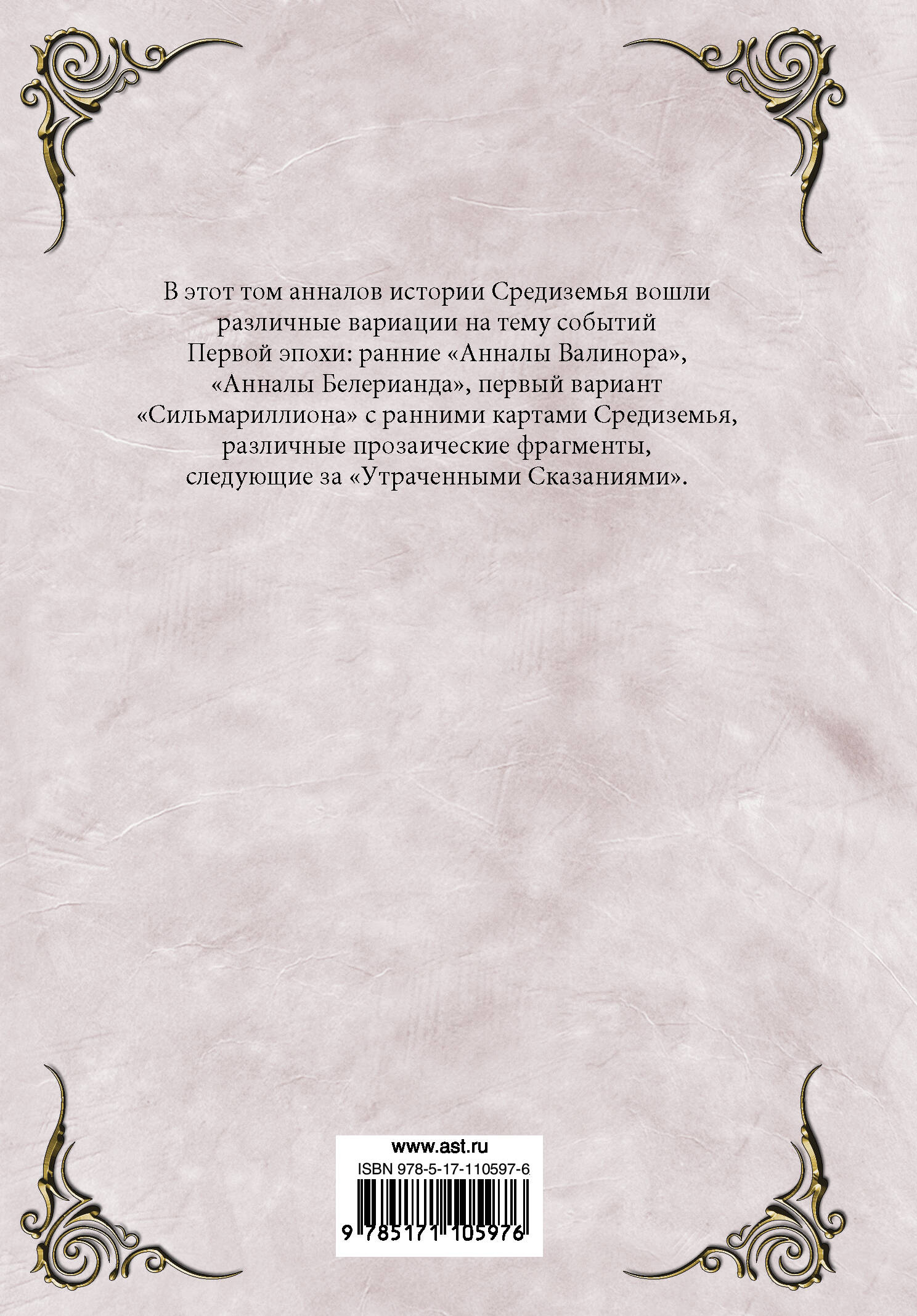 В этот том анналов истории Средиземья вошли различные вариации на тему событий Первой эпохи: ранние "Анналы Валинора", "Анналы Белерианда", первый вариант "Сильмариллиона" с ранними картами Средиземья, различные прозаические фрагменты, следующие за "Утраченными Сказаниями".| Издательство | ИЗДАТЕЛЬСТВО "АСТ" |