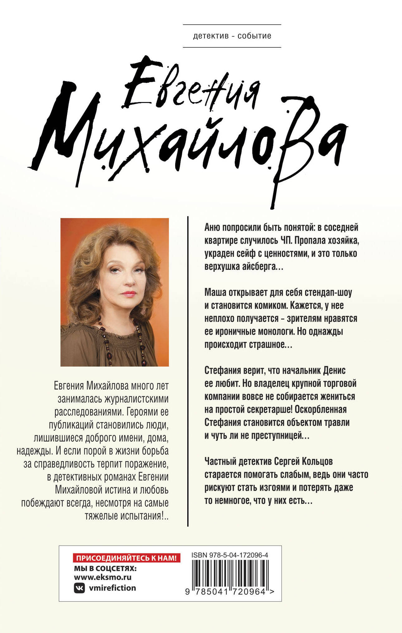 Аню попросили быть понятой: в соседней квартире случилось ЧП. Пропала хозяйка, украден сейф с ценностями, и это только верхушка айсберга… Маша открывает для себя стендап-шоу и становится комиком. Кажется, у нее неплохо получается - зрителям нравятся ее ироничные монологи. Но однажды происходит страшное… Стефания верит, что начальник Денис ее любит. Но владелец крупной торговой компании вовсе не собирается жениться на простой секретарше! Оскорбленная Стефания становится объектом травли и чуть ли не преступницей… Частный детектив Сергей Кольцов старается помогать слабым, ведь они часто рискуют стать изгоями и потерять даже то немногое, что у них есть… Героини остросюжетных рассказов Евгении Михайловой по-разному понимают справедливость, но готовы ради нее и на преступления, и на подвиги. Им приходится столкнуться с подлостью и предательством самых близких людей, но они, несмотря ни на что, находят в себе душевные силы противостоять злу и выйти из схватки с ним победителями. Герои этих новелл - обычные люди, они беспомощны, беззащитны и поодиночке пропадут, но могут помочь друг другу в схватке с несправедливостью.| Издательство | ООО "Издательство "Эксмо" |