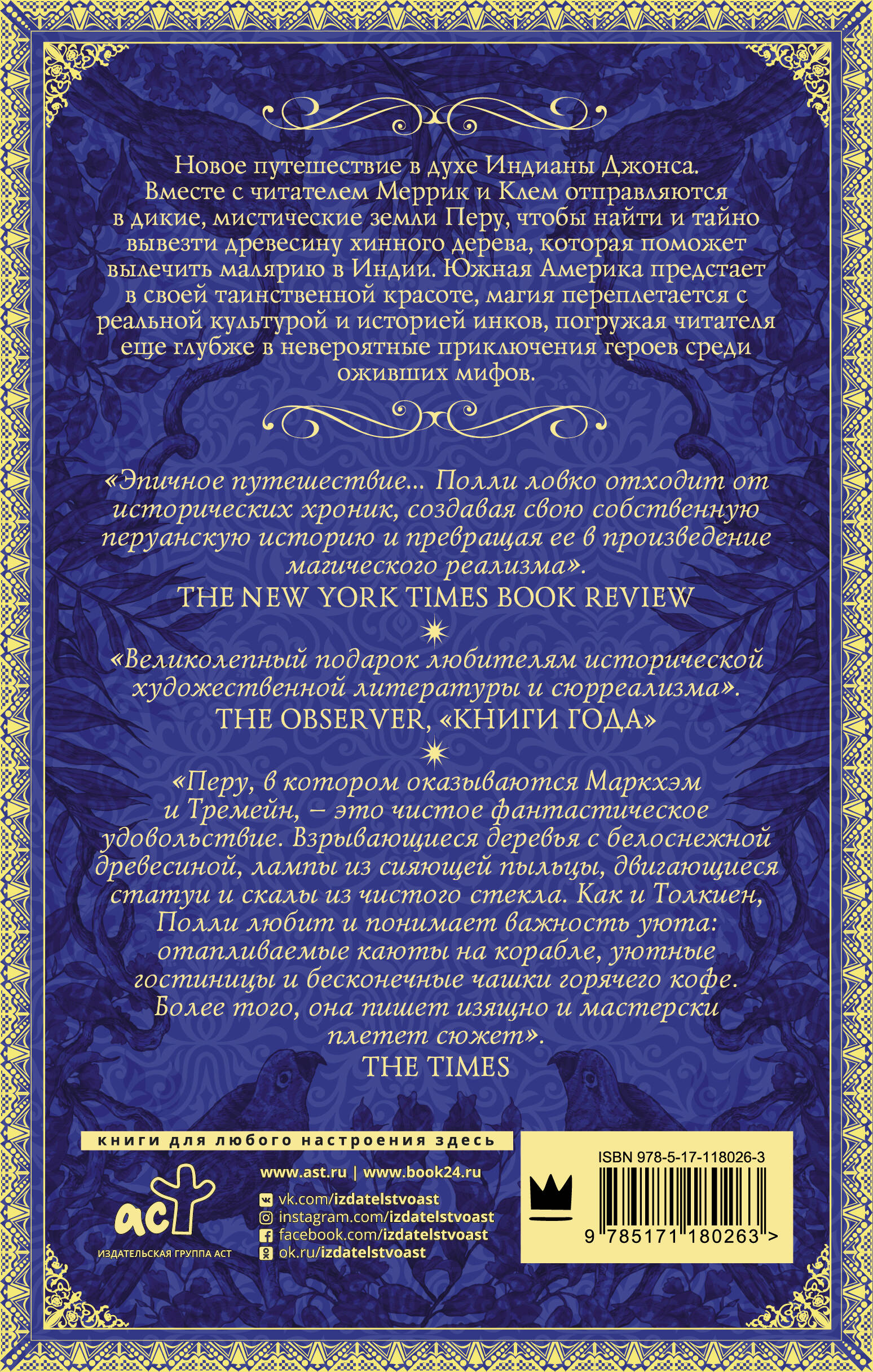 В диких, неисследованных землях Перу находится священный городок под названием Бедлам. Он стоит у самой границы таинственного леса, в глубине которого растут хинные деревья, или цинхоны, кора которых - единственное известное лекарство от малярии. Именно туда и отправляются Меррик и Клем, чтобы найти и тайно вывезти черенки цинхон для создания плантации. Южная Америка предстает в своей загадочной красоте: взрывающиеся деревья с белоснежной древесиной, лампы из сияющей пыльцы, двигающиеся статуи и скалы из чистого стекла… Магия переплетается с реальной культурой и историей инков, погружая читателя еще глубже в невероятные приключения героев среди оживших мифов.| Издательство | ИЗДАТЕЛЬСТВО "АСТ" |