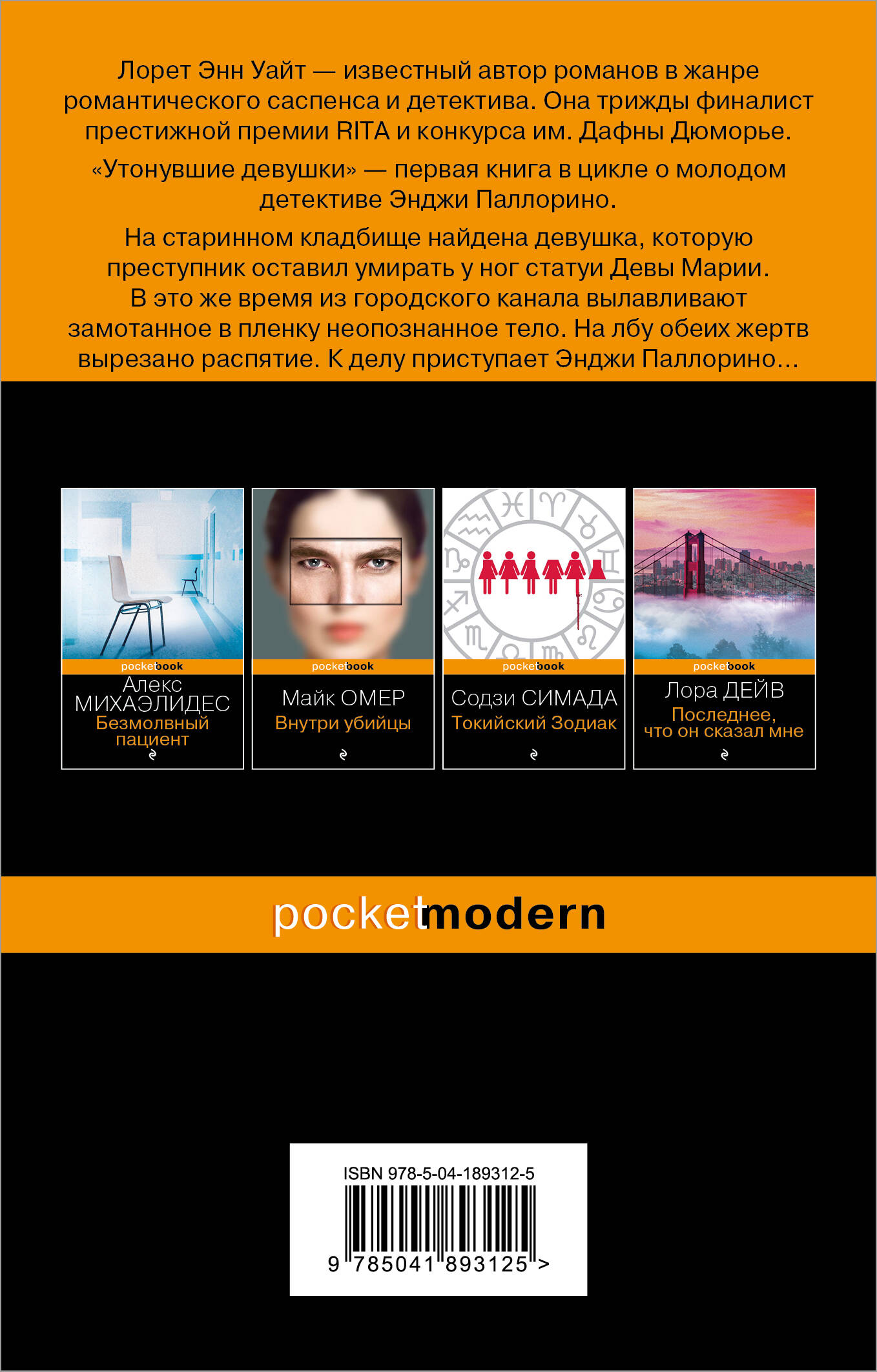 Лорет Энн Уайт - известный автор романов в жанре романтического саспенса и детектива. Она трижды финалист престижной премии RITA и Конкурса им. Дафны Дюморье. «Утонувшие девушки» - первая книга в цикле о молодом детективе Энджи Паллорино. На старинном кладбище найдена девушка, которую преступник оставил умирать у ног статуи Девы Марии. В это же время из городского канала вылавливают замотанное в пленку неопознанное тело. На лбу обеих жертв вырезано распятие. К делу приступает Энджи Паллорино, которую тоже поджидают опасности на каждом шагу...