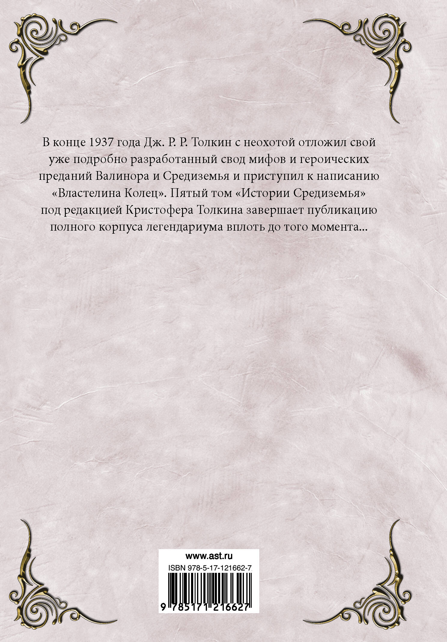 В конце 1937 года Дж. Р. Р. Толкин с неохотой отложил свой уже подробно разработанный cвод мифов и героических преданий Валинора и Средиземья и приступил к написанию "Властелина Колец". Пятый том "Истории Средиземья" под редакцией Кристофера Толкина завершает публикацию полного корпуса легендариума вплоть до того момента...| Издательство | Издательство "АСТ" |