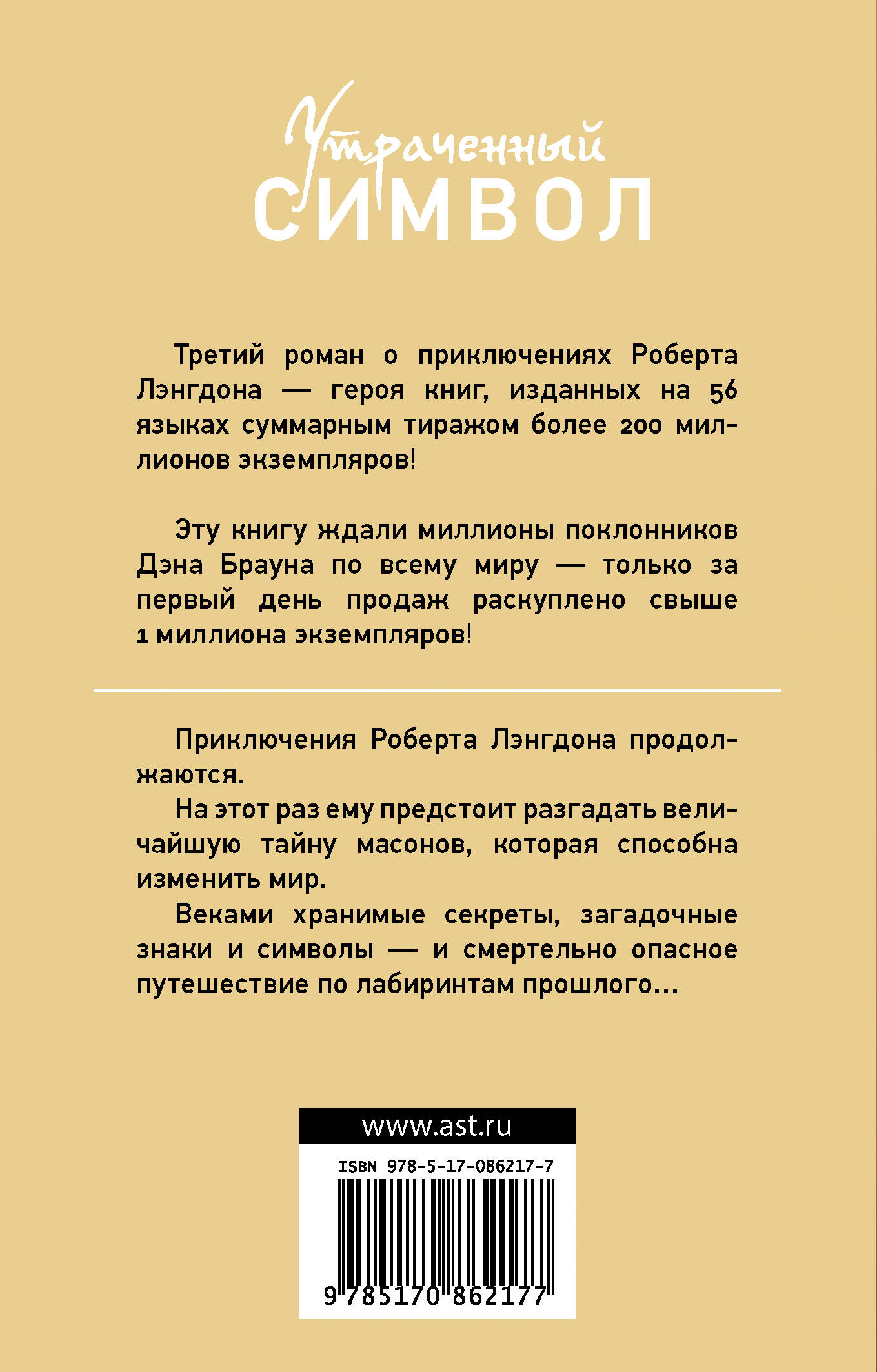 Приключения Роберта Лэнгдона продолжаются. На этот раз ему предстоит разгадать величайшую тайну масонов, которая способна изменить мир. Веками хранимые секреты, загадочные знаки и символы - и смертельно опасное путешествие по лабиринтам прошлого…| Издательство | ИЗДАТЕЛЬСТВО "АСТ" |