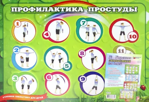 Комплект "Утренняя гимнастика для детей" содержит 4 плаката с методическим сопровождением: