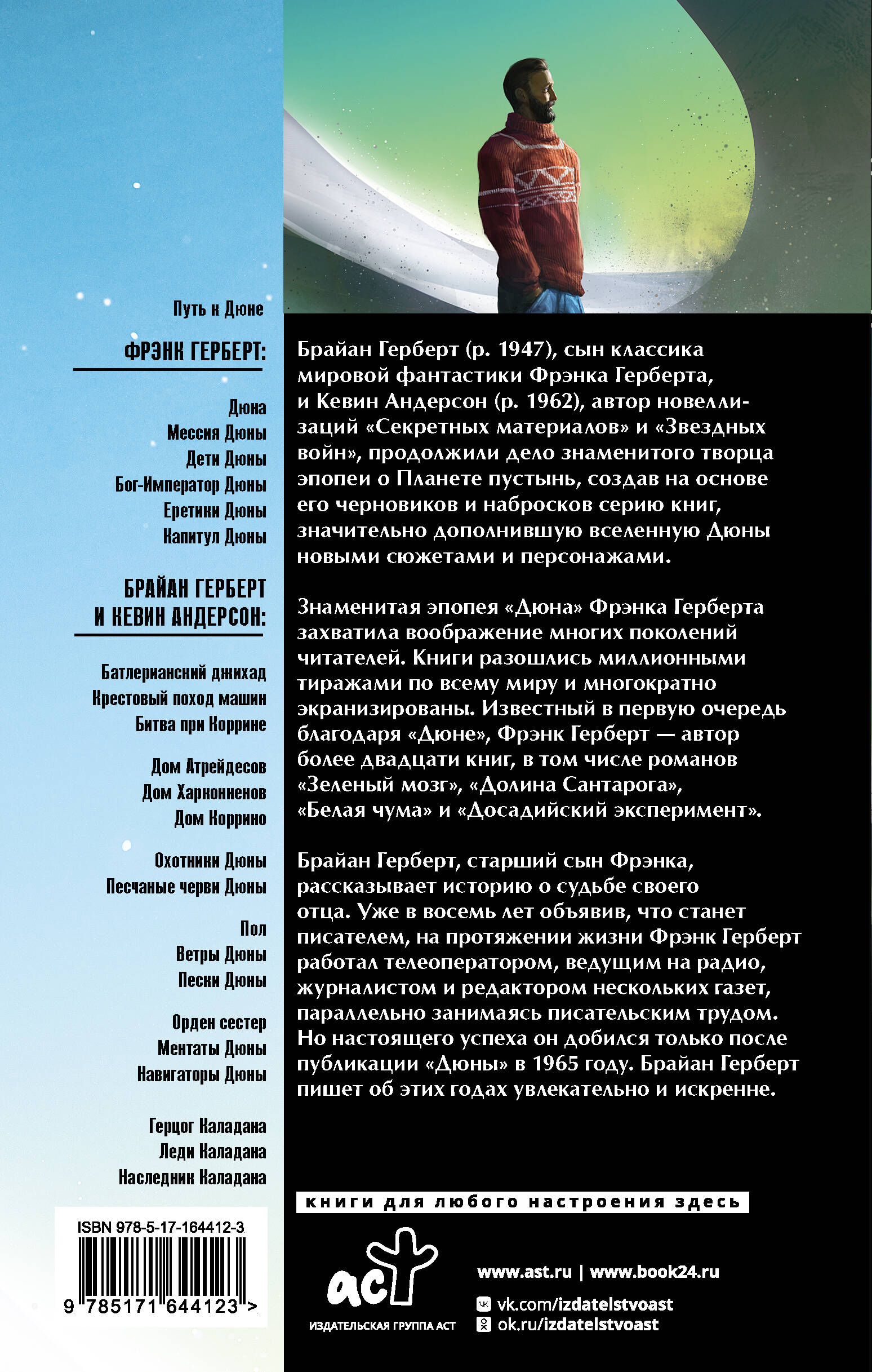 - Фрэнк Герберт - известный научный фантаст, автор бестселлера «Дюна», пяти его продолжений и двух десятков других романов, среди которых выделяются такие книги как «Зеленый мозг» и «Долина Сантарога». - «Увидевший Дюну» - подробная и увлекательная биография Фрэнка Герберта, написанная его сыном Брайаном. Книга содержит множество интереснейших подробностей о молодости писателя, его семье, работе над «Дюной» и другими книгами, экранизации Дэвида Линча и отношениях Герберта с другими мастерами научной фантастики: Робертом Хайнлайном, Джеком Вэнсом и другими гигантами. - Брайан Герберт - известный писатель, в соавторстве с Кевином Андерсоном он написал около двух десятков романов по вселенной «Дюны», в том числе и «Орден сестер», вдохновивший создателей нового телесериала HBO «Дюна: Пророчество».| Издательство | Издательство "АСТ" |