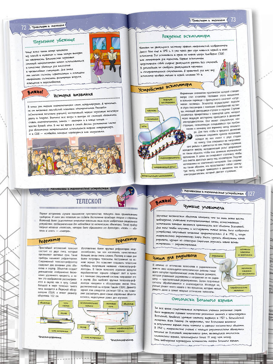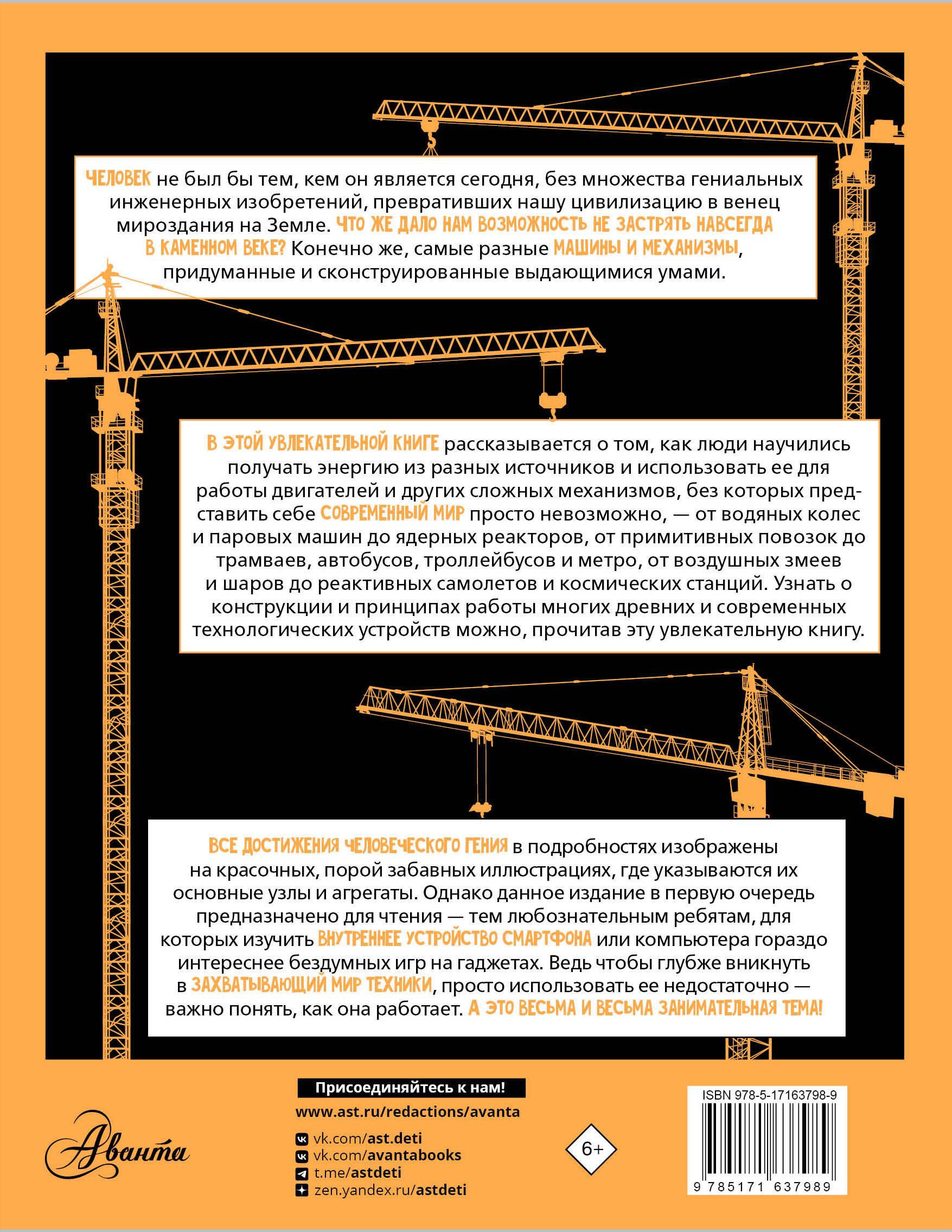Человек не был бы тем, кем он является сегодня, без множества гениальных инженерных изобретений, превративших нашу цивилизацию в венец мироздания на Земле. Что же дало нам возможность не застрять навсегда в каменном веке? Конечно же, самые разные машины и механизмы, придуманные и сконструированные выдающимися умами. В этой увлекательной книге рассказывается о том, как люди научились получать энергию из разных источников и использовать ее для работы двигателей и других сложных механизмов, без которых представить себе современный мир просто невозможно, - от водяных колес и паровых машин до ядерных реакторов, от примитивных повозок до трамваев, автобусов, троллейбусов и метро, от воздушных змеев и шаров до реактивных самолетов и космических станций. Узнать о конструкции и принципах работы многих древних и современных технологических устройств можно, прочитав эту увлекательную книгу. Все достижения человеческого гения в подробностях изображены на красочных, порой забавных иллюстрациях, где указываются их основные узлы и агрегаты. Однако данное издание в первую очередь предназначено для чтения - тем любознательным ребятам, для которых изучить внутреннее устройство смартфона или компьютера гораздо интереснее бездумных игр на гаджетах. Ведь чтобы глубже вникнуть в захватывающий мир техники, просто использовать ее недостаточно - важно понять, как она работает. А это весьма и весьма занимательная тема!