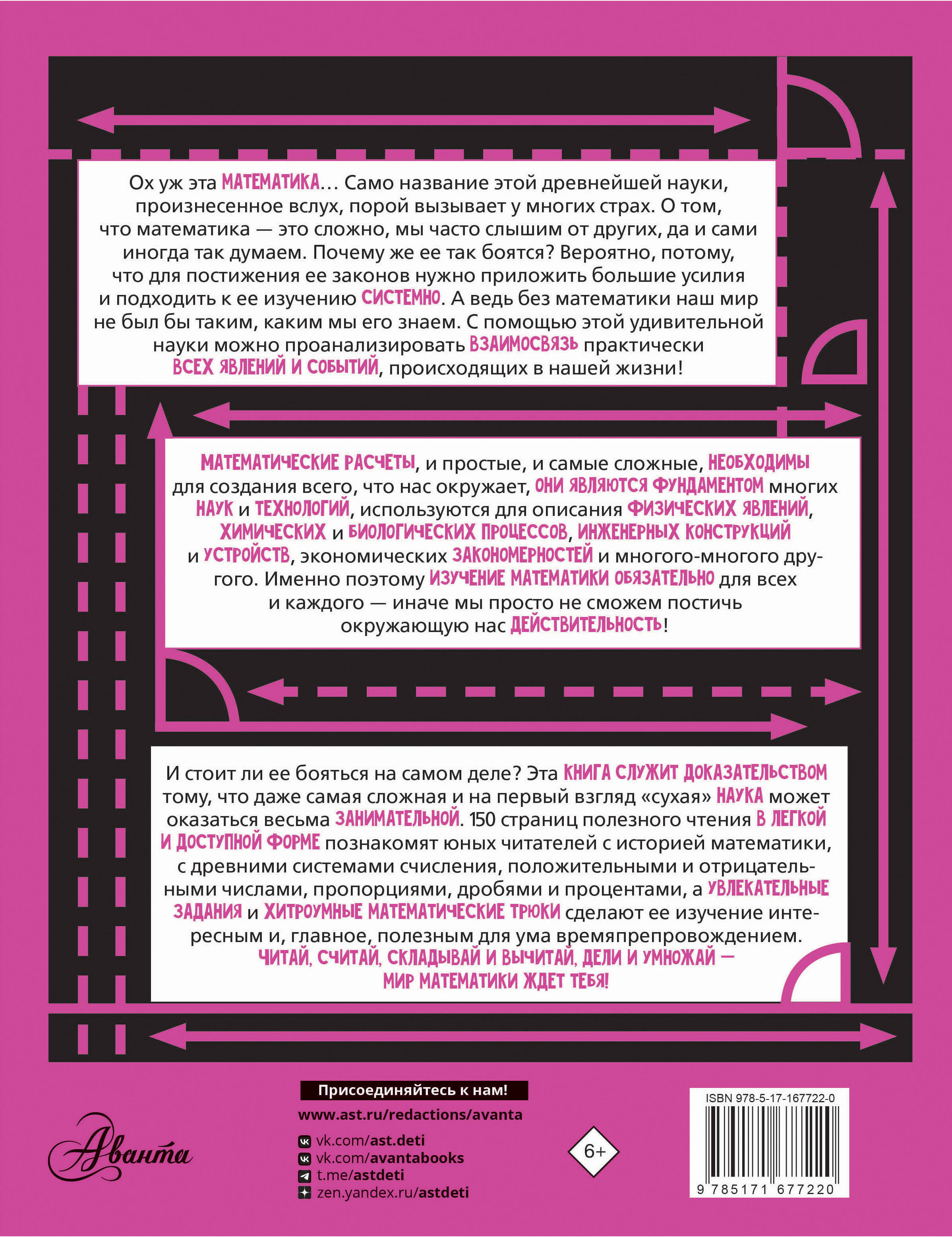 Представить современный мир без математики абсолютно невозможно, ведь все, что нас окружает, подчиняется ее незыблемым законам. Недаром выражение "как дважды два четыре" означает непререкаемую истину. Постигать основы этой царицы всех наук мы начинаем в раннем детстве спростого счета, затем на протяжении жизни сталкиваемся с математическими алгоритмами ежедневно в самых разных сферах деятельности. В этой книге основы математики представлены в доступной игровой форме, благодаря чему ребята смогут легко освоить этот предмет самостоятельно. 150 страниц полезного чтения расскажут им об истории этой точной науки и о древних системах счисления, познакомят с нумерацией, счетом, разрядами и классами чисел, процентами и дробями, научат основам геометрии. Кроме того, здесьчитатели найдут множество математических трюков, которые позволят им удивить друзей и одноклассников. А главное - изучая книгу, юные исследователи смогут убедиться, что математика вовсе не так уж страшна, как о ней говорят, а напротив, весьма занимательная и увлекательная наука! Для среднего школьного возраста.