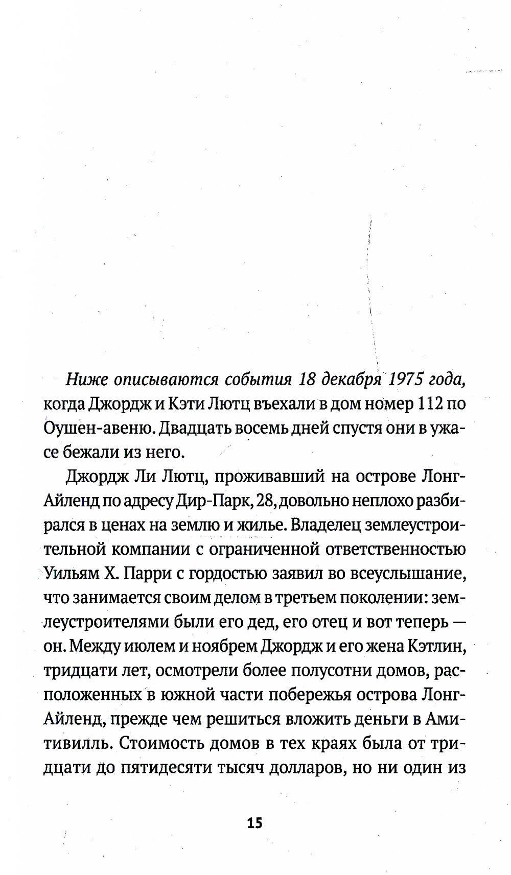Когда Кэти и Джордж Лютц покупали дом по адресу Оушен-авеню, 112, они и не подозревали, какие страшные тайны таит он в своих стенах, пропитанных кровью невинно убиенных и настоящим ужасом. Этот дом в уютном и тихом районе Амитивилль на Лонг-Айленде выставлен на продажу, но по сей день никто не решился приобрести его.| Издательство | Рипол Классик |