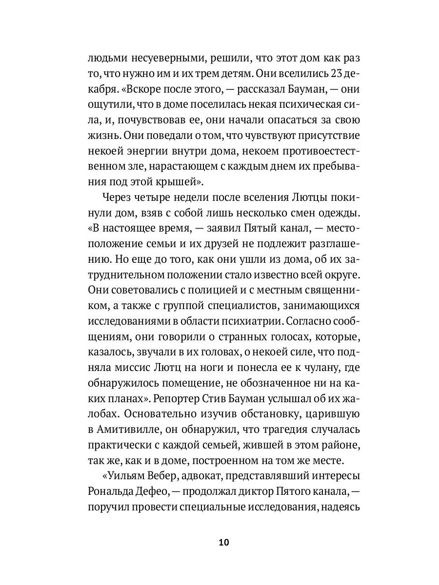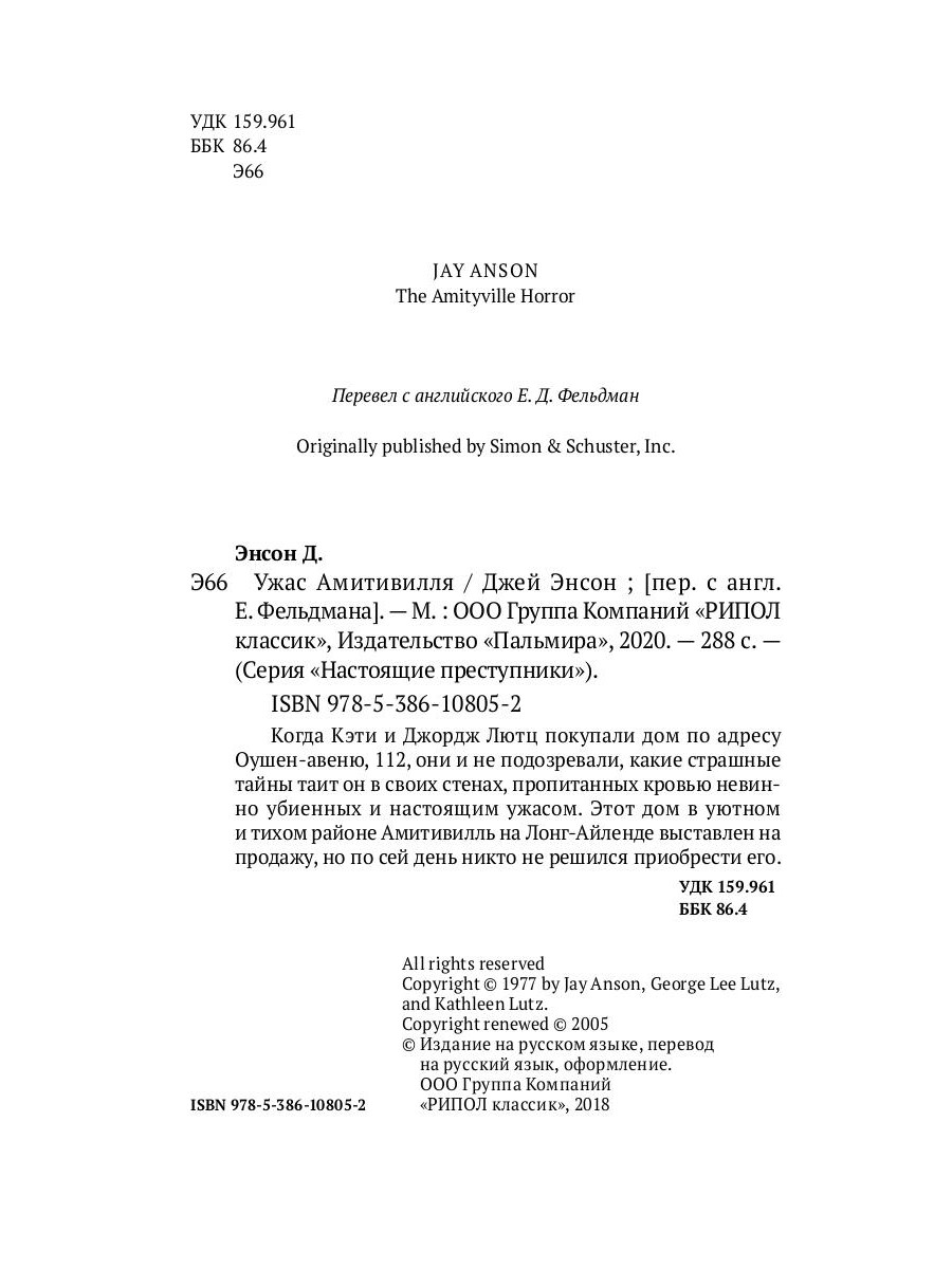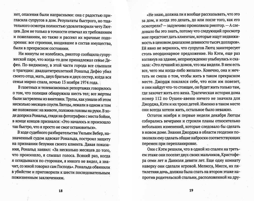 Когда Кэти и Джордж Лютц покупали дом по адресу Оушен-авеню, 112, они и не подозревали, какие страшные тайны таит он в своих стенах, пропитанных кровью невинно убиенных и настоящим ужасом. Этот дом в уютном и тихом районе Амитивилль на Лонг-Айленде выставлен на продажу, но по сей день никто не решился приобрести его.| Издательство | Рипол Классик |