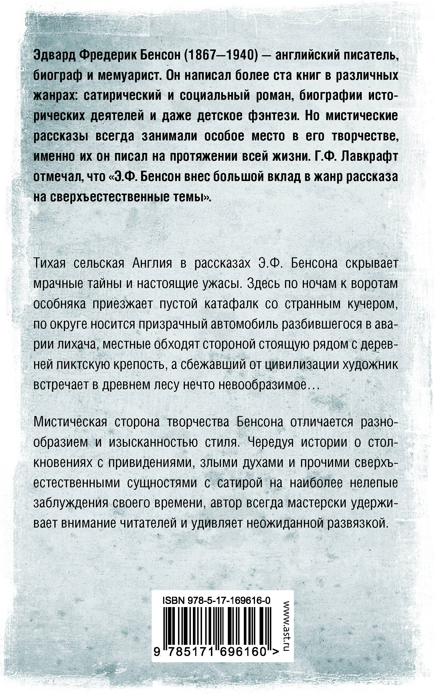 - Эдвард Фредерик Бенсон - известный британский писатель, в творчестве которого соседствуют мистические рассказы, сатирические романы и биографии Шарлотты Бронте и других выдающихся людей. - «Ужас в ночи» - сборник избранных мистических рассказов автора. Они отличаются разнообразием, изобретательностью сюжетов и изысканностью стиля. - На страницах сборника вас ждут атмосферные, мрачные, порой смешные, порой - откровенно жуткие истории о встречах с призраками, духами и другими сверхъестественными существами. - «Ужас в ночи» - это классика хоррора. Для поклонников творчества Элджернона Блэквуда, Говарда Филлипса Лавкрафта и Артура Мэкена.| Издательство | Издательство "АСТ" |