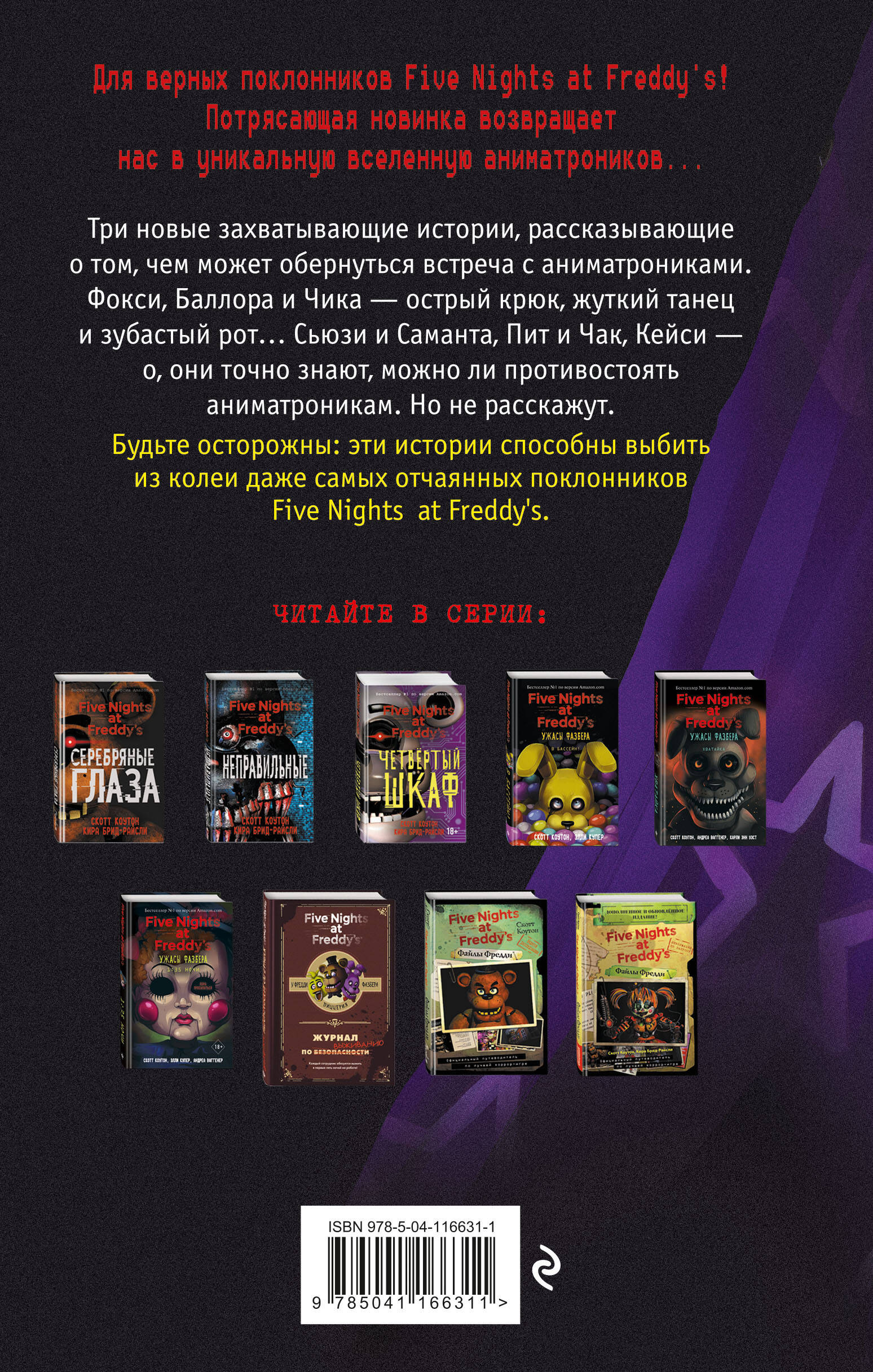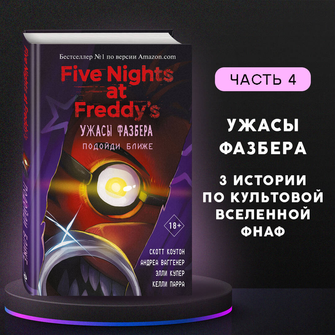 ДЛЯ САМЫХ ПРЕДАННЫХ ФАНАТОВ! Легендарные «ФНАФ», «Пять ночей с Фредди», вернулись! Мы знаем, вы по ним скучали: Фокси, Баллора и Чика - острый крюк, жуткий танец и зубастый рот… «Подойди ближе» (STEP CLOSER) - четвертая книга новой линейки книг об аниматрониках! Захватывающая новинка, которая возвращает нас в уникальную Вселенную и рассказывает о том, чем может обернуться встреча с аниматрониками. В книгу вошли три повести: «Подойди ближе» (Step Closer), «Потанцуй со мной» ( Dance with Me), «Возвращение домой» (Coming Home). Будьте осторожны: эти истории способны выбить из колеи даже самых отчаянных поклонников FNAF, Five Nights at Freddy's! Можно читать в произвольном порядке, каждая новая история имеет законченный сюжет.| Издательство | Эксмо |