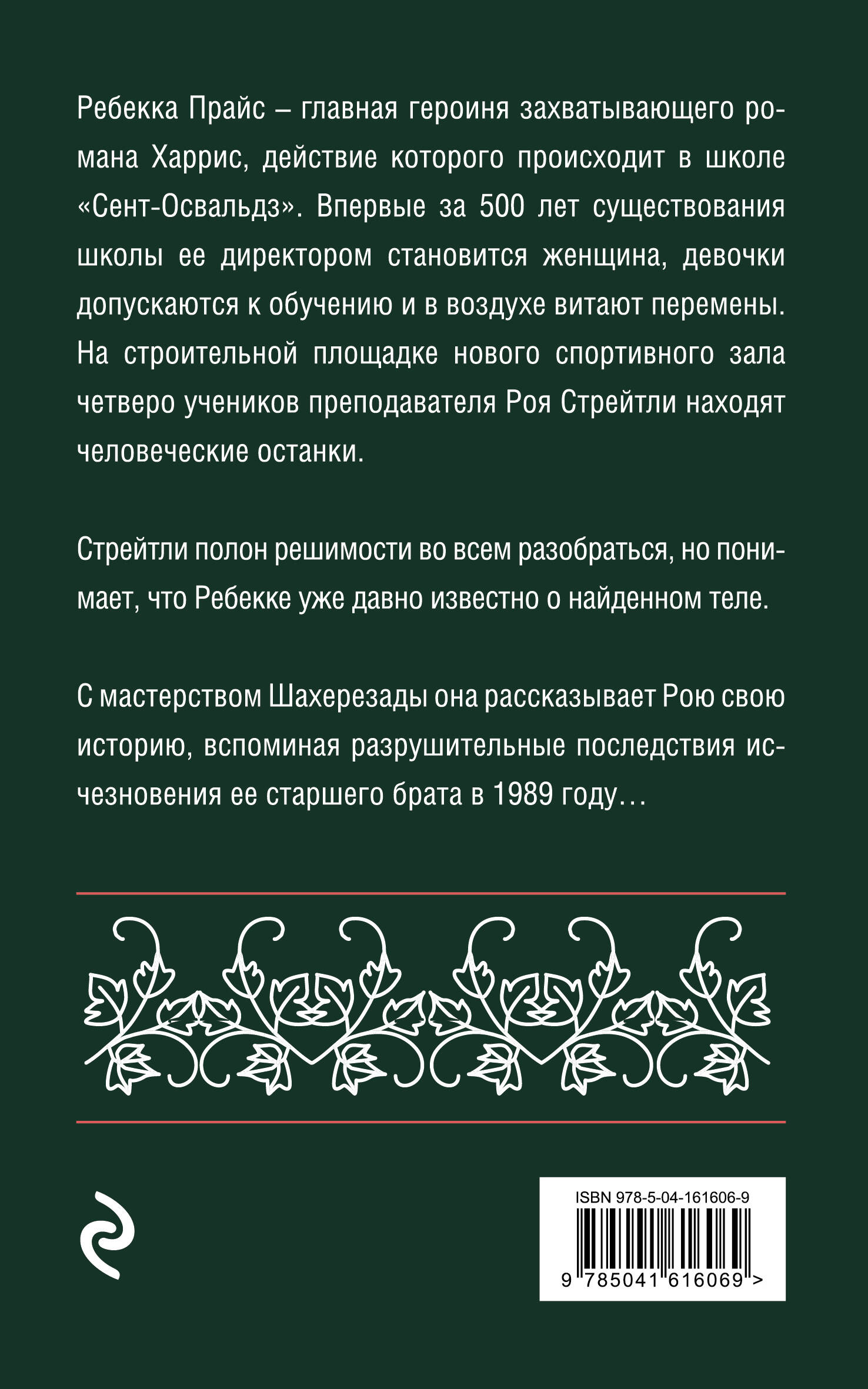 Джоанн Харрис возвращает нас в мир Сент-Освальдз и рассказывает историю Ребекки Прайс, первой женщины, ставшей директором школы. Она полна решимости свергнуть старый режим, и теперь к обучению допускаются не только мальчики, но и девочки. Но все планы рушатся, когда на территории школы во время строительных работ обнаруживаются человеческие останки. Профессор Рой Стрейтли намерен во всем разобраться, но Ребекка день за днем защищает тайны, оставленные в прошлом. Этот роман - путешествие по темным уголкам человеческого разума, где память, правда и факты тают, как миражи. Стрейтли и Ребекка отчаянно хотят скрыть часть своей жизни, но прошлое контролирует то, что мы делаем, формирует нас такими, какие мы есть в настоящем, и ничто не остается тайным.| Издательство | ООО "Издательство "Эксмо" |