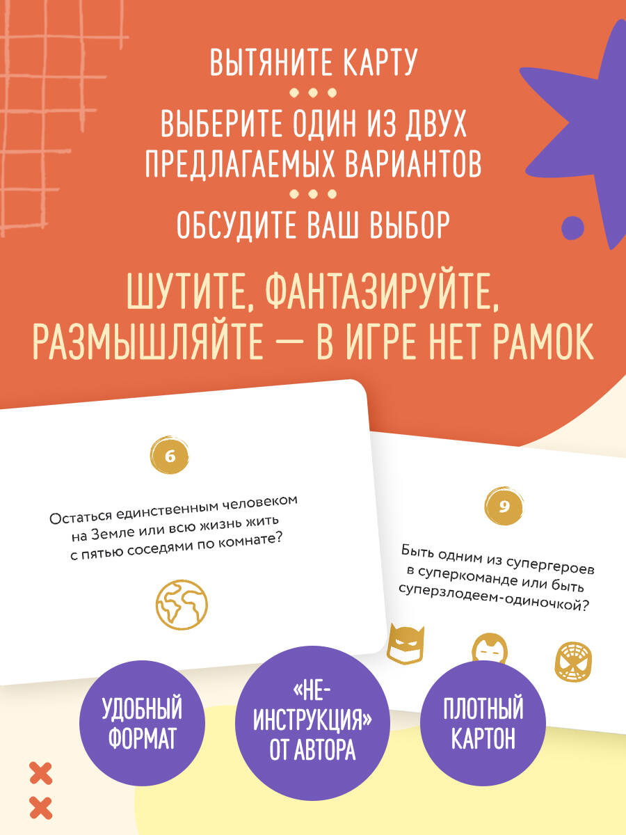 ОТ АВТОРА БЕСТСЕЛЛЕРОВ «ЧЕРТОВЫ ПОДРОСТКИ!» И «ЧЕРТОВА ШКОЛА!». 100 игровых карт, которые помогут наладить общение, укрепить доверие и по-новому узнать вашего подростка. Все вопросы составлены детским и подростковым психологом Никитой Карповым, который хорошо знает, с какими трудностями сталкиваются взрослеющие дети. Подростки постепенно отдаляются от родителей, хранят свои интересы в секрете и боятся делиться чувствами со взрослыми. Поэтому так важно поддерживать близкий контакт и проводить время вместе, получая положительные эмоции. На каждой карточке веселый, неожиданный или серьезный вопрос с двумя вариантами ответа. Выберите один из них, и вскоре вас увлечет захватывающая дискуссия! Вопросы ставят участников перед моральным выбором или переносят в необычные ситуации, где нужно быстро сориентироваться и принять решение. Игра поможет понять интересы каждого участника, развивает эмоциональный интеллект и критическое мышление. Она подталкивает подростков и родителей к откровенности и теплому, дружескому общению. Правил нет - каждый может проявить фантазию и придумать свои условия. В комплект входит 100 цветных карт из плотного картона с закругленными углами и «неинструкция» от автора. Игра станет отличным подарком не только ребенку, друзьям, супругам, но и психологам, учителям и другим специалистам. Компактный размер позволяет брать карты с собой в дорогу, на прогулку, в путешествие или поход. Об авторе: Никита Карпов - детский и подростковый психолог с более чем 20-летним опытом работы. Автор книг «Чертовы подростки!», «Чертовы скандалы!» и «Чертова школа!» с общим тиражом 100 000 экземпляров. Ведущий программы «Трудности перехода» на Радио «Маяк». Провел десятки лекций и вебинаров, сотни тренингов и тысячи консультаций. Автор известного телеграм-канала «Чертовы подростки», отец двоих детей.| Издательство | ООО "Издательство "Эксмо" |