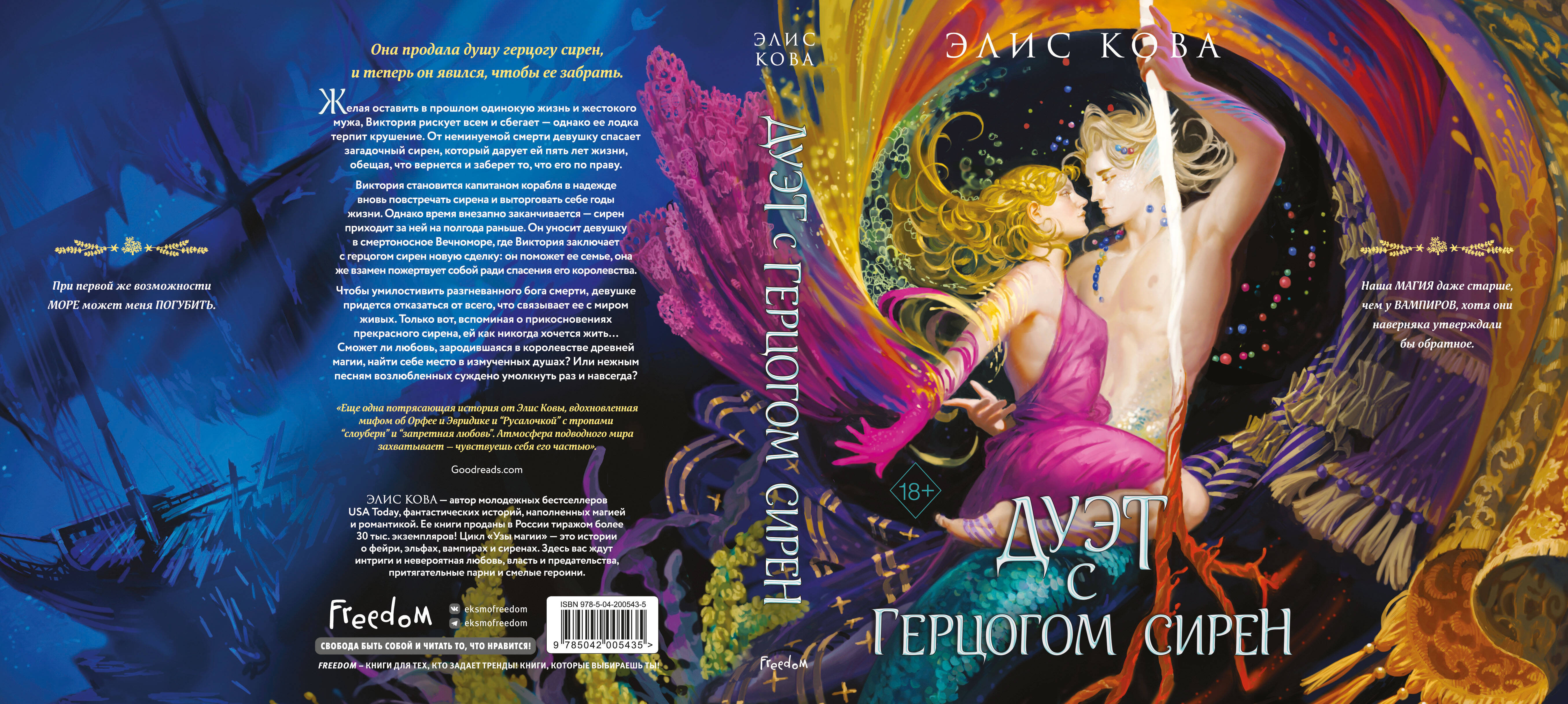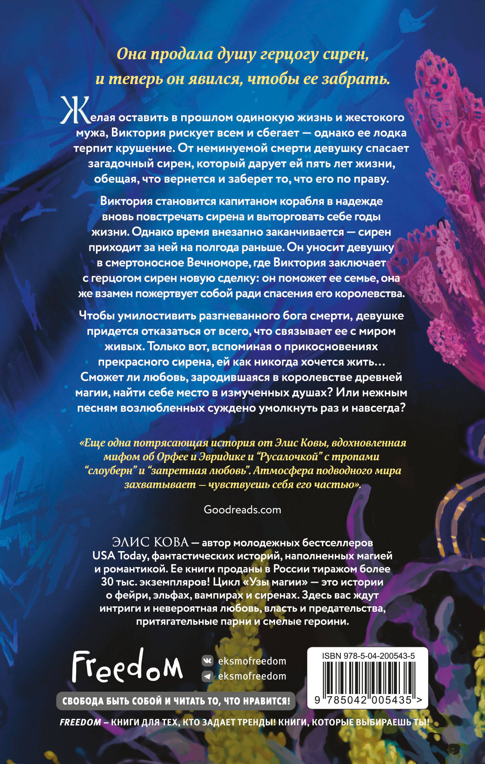 Захватывающее романтическое фэнтези о сиренах, древней магии, забытых богах и тайнах, которые хранят глубины. Писательница, вдохновившись сказкой о Русалочке и мифом об Орфее и Эвридике, создала новую удивительную историю любви с тропами «запретная любовь», «второй шанс на любовь» и «слоуберн». Для тех, кто предпочитает романы, где любовь торжествует, несмотря ни на что! Виктория - жена смотрителя маяка, жестокого и контролирующего каждый ее шаг, убедившего, что такую, как она, никто никогда не полюбит. В надежде забыть прошлую жизнь, Виктория рискует всем и сбегает. Однако ее лодка терпит крушение. От неминуемой смерти в глубинах моря девушку спасает такой пугающий, но пленительный сирен, пообещавший, что через пять лет он вернется и заберет то, что его по праву. Пять лет приключений, о которых она всегда мечтала. Практически вечность… Однако время внезапно заканчивается, и теперь Виктории придется отказаться от всего, что связывает ее с миром живых, чтобы умилостивить разгневанного бога смерти и спасти подводный мир, находящийся на грани уничтожения… Серия «Узы магии» набрала более 49 тыс. отзывов на Amazon! А романы «Сделка с королем эльфов» и «Танец с принцем фейри» стали бестселлерами № 1 более чем в 15 категориях Amazon! Рекомендуется к прочтению всем фанатам романов Холли Блэк, Сары Дж. Маас.| Издательство | ООО "Издательство "Эксмо" |