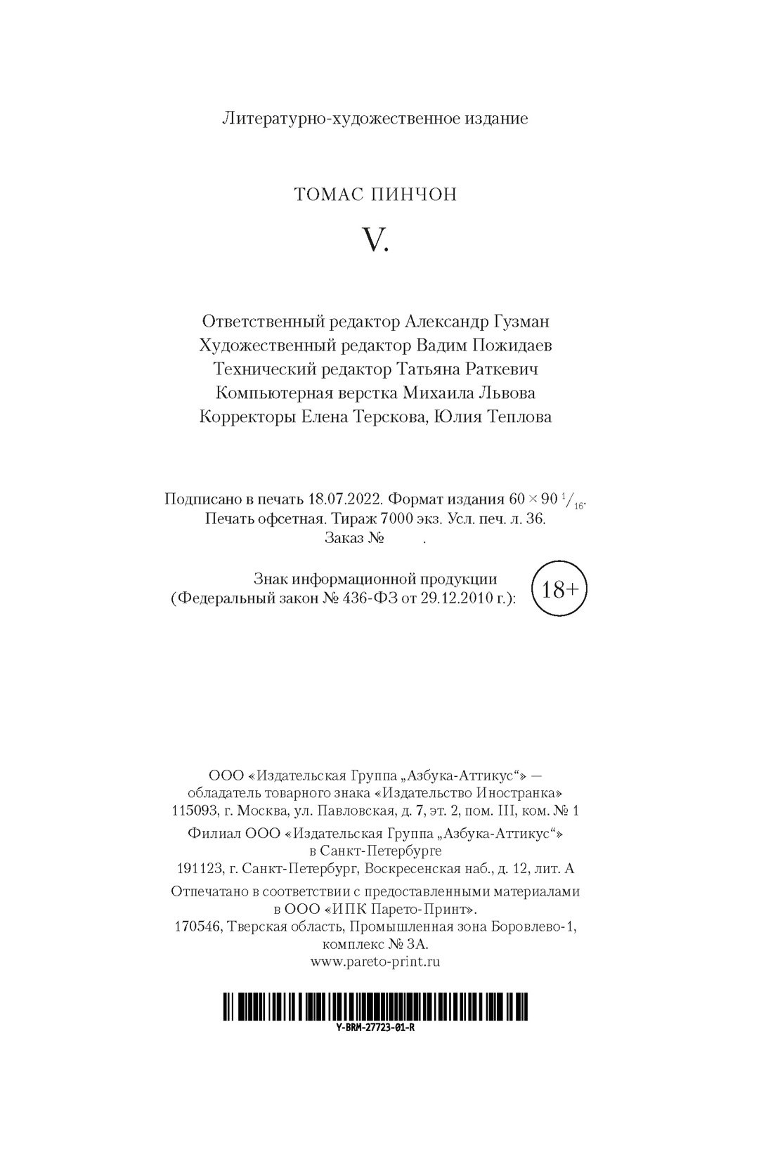 Томас Пинчон - наряду с Сэлинджером «великий американский затворник», один из крупнейших писателей мировой литературы XX, а теперь и XXI века, после первых же публикаций единодушно признанный классиком уровня Набокова, Джойса и Борхеса. В его дебютном романе «V.», удостоенном Фолкнеровской премии и вошедшем в шорт-лист Национальной книжной премии США, читатели впервые познакомились с фирменной пинчоновской одержимостью глобальными заговорами и тайными пружинами истории - и навеки очаровались. Здесь пересекаются пути Бенни Профана, «шлемиля и одушевленного йо-йо», и группы нью-йоркской богемы, известной как Цельная Больная Шайка, и Херберта Шаблона, через множество стран и десятилетий идущего по следу неуловимой V. - то ли женщины, то ли идеи... Перевод публикуется в новой редакции.| Издательство | Иностранка |
