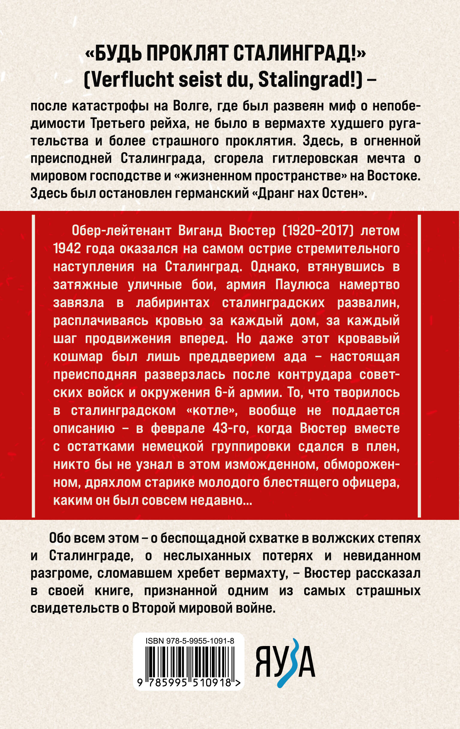 «БУДЬ ПРОКЛЯТ СТАЛИНГРАД!» (Verflucht seist du, Stalingrad!) - после катастрофы на Волге, где был развеян миф о «непобедимости» Третьего Рейха, не было в Вермахте худшего ругательства и более страшного проклятия. Здесь, в огненной преисподней Сталинграда, сгорела гитлеровская мечта о мировом господстве и «жизненном пространстве» на Востоке. Здесь был остановлен германский «Дранг нах Остен». Обер-лейтенант Виганд Вюстер (1920-2017) летом 1942 года оказался на самом острие стремительного наступления на Сталинград. Однако, втянувшись в затяжные уличные бои, армия Паулюса намертво завязла в лабиринтах сталинградских развалин, расплачиваясь кровью за каждый дом, за каждый шаг продвижения вперед. Но даже этот кровавый кошмар был лишь преддверием ада - настоящая преисподняя разверзлась после контрудара советских войск и окружения 6-й армии. То, что творилось в сталинградском «котле», вообще не поддается описанию - в феврале 43-го, когда Вюстер вместе с остатками немецкой группировки сдался в плен, никто бы не узнал в этом изможденном, обмороженном, дряхлом старике молодого блестящего офицера, каким он был совсем недавно… Обо всем этом - о беспощадной схватке в волжских степях и Сталинграде, о неслыханных потерях и невиданном разгроме, сломавшем хребет Вермахту, - Вюстер рассказал в своей книге, признанной одним из самых страшных свидетельств о Второй мировой войне.| Издательство | Яуза-пресс ООО |
