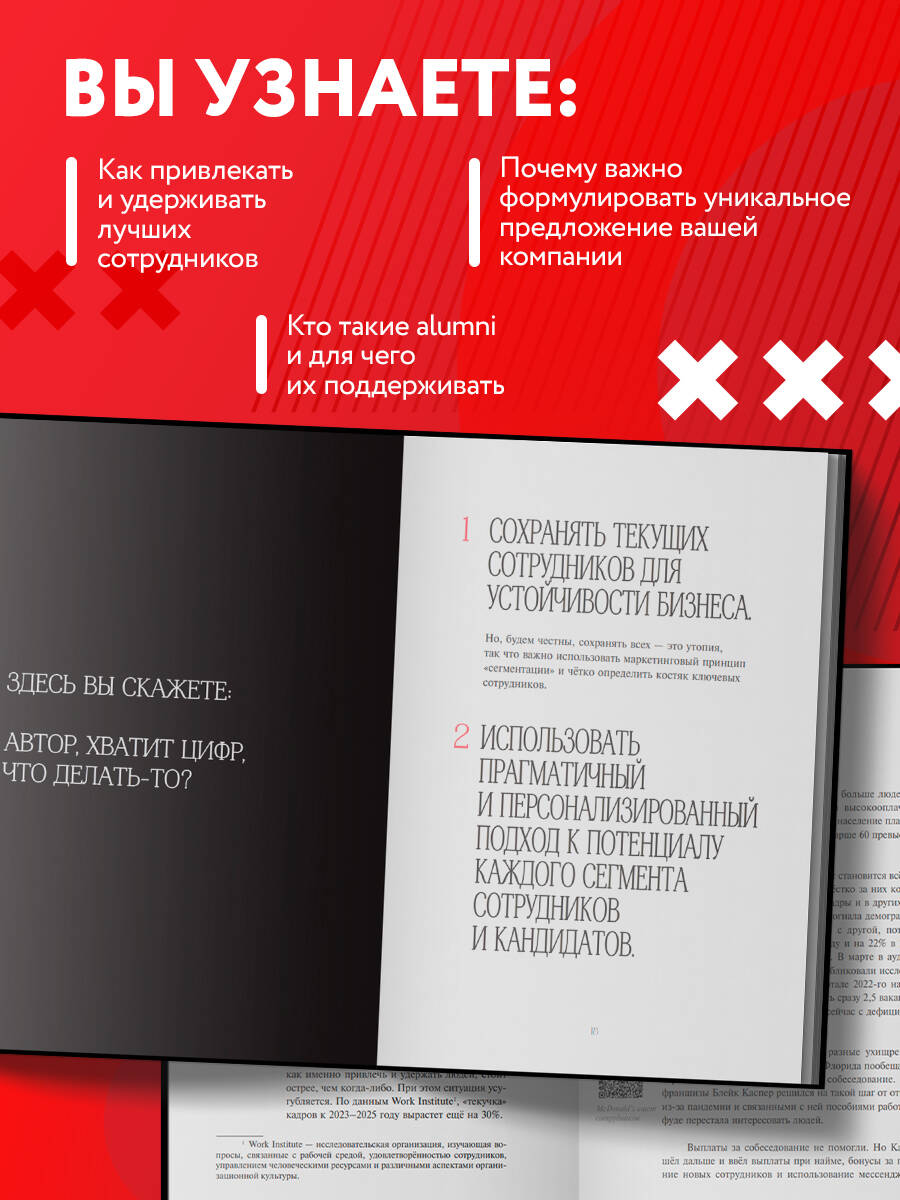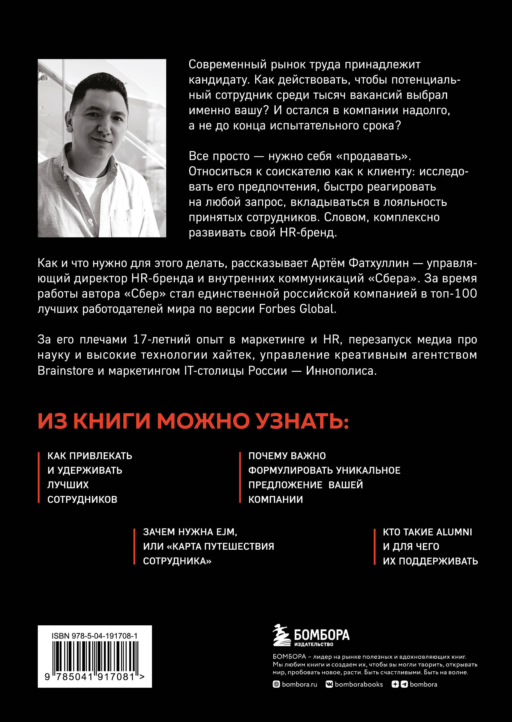 Современный рынок труда принадлежит кандидату. Как действовать, чтобы потенциальный сотрудник среди тысяч вакансий выбрал именно вашу? И остался в компании надолго, а не до конца испытательного срока? Все просто - нужно себя «продавать». Относиться к соискателю как к клиенту: исследовать его предпочтения, быстро реагировать на любой запрос, вкладываться в лояльность принятых сотрудников. Словом, комплексно развивать свой HR-бренд. Как и что нужно для этого делать, рассказывает Артём Фатхуллин - управляющий директор HR-бренда и внутренних коммуникаций Сбера. За время работы автора Сбер стал единственной российской компанией в Топ-100 лучших работодателей мира по версии Forbes Global. За его плечами более чем 17-летний опыт в маркетинге и HR, перезапуск медиа про науку и высокие технологии Хайтек, управление креативным агентством Brainstore и маркетингом IT-столицы России - Иннополисом. Из книги можно узнать: • как привлекать и удерживать лучших сотрудников; • зачем нужна EJM, или «карта путешествия сотрудника»; • почему важно формулировать уникальное предложение вашей компании; • кто такие alumni и для чего их поддерживать.