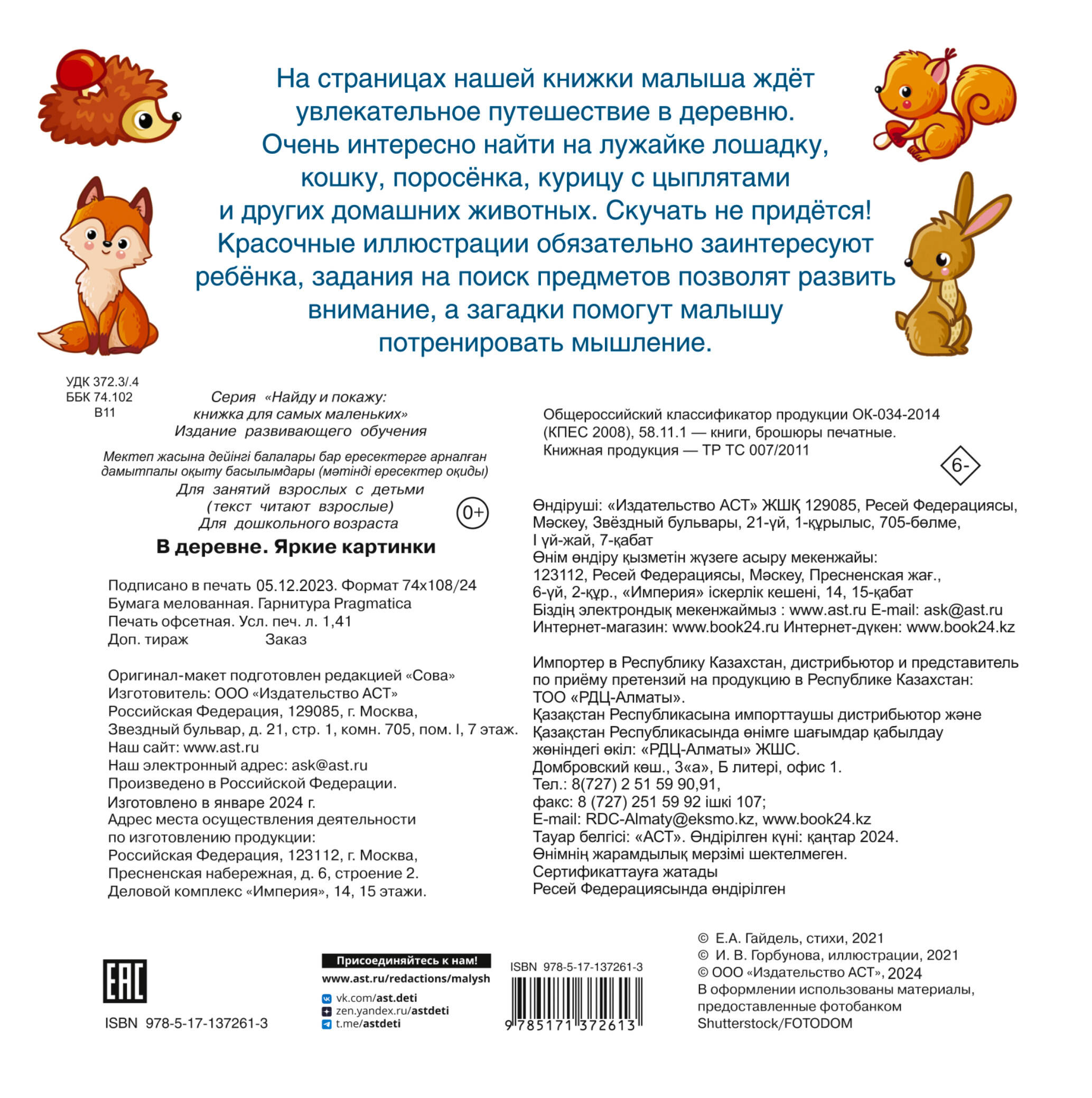О чём эта книга На страницах красочной книги «В деревне. Яркие картинки» ребёнка ждёт увлекательное путешествие за город и встреча с обитателями фермы: коровами и козами, поросятами и курами. Малышу предлагаются занимательные задания на поиск предметов - находя и показывая картинки, ребёнок сможет развить внимание и зрительное восприятие, выучит названия домашних животных. Кому эта книга будет интересна Книга с заданиями для детей дошкольного возраста. Каковы особенности этой книги • 24 красочно иллюстрированные страницы с весёлыми заданиями. • Занимаясь по книге, ребёнок расширит кругозор. • Увлекательные задания надолго займут малыша.| Издательство | ИЗДАТЕЛЬСТВО "АСТ" |