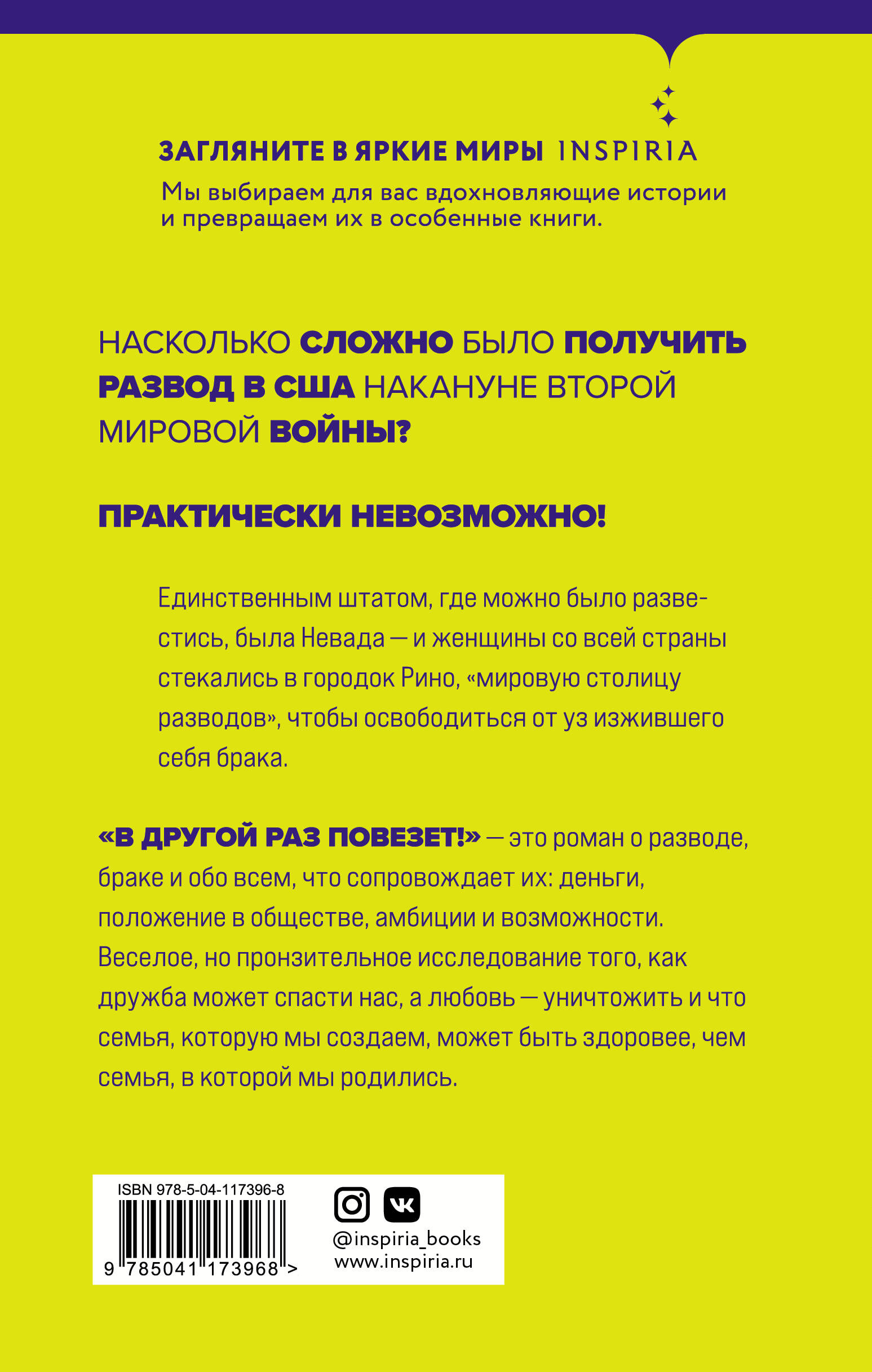Насколько сложно было получить развод в США накануне Второй мировой войны? Практически невозможно! Единственным штатом, где можно было развестись, была Невада - и женщины со всей страны стекались в городок Рино, «мировую столицу разводов», чтобы освободиться от уз изжившего себя брака. «В другой раз повезёт!» - это роман о разводе, браке и обо всем, что сопровождает их: деньги, положение в обществе, амбиции и возможности. Веселое, но пронзительное исследование того, как дружба может спасти нас, а любовь - уничтожить, и что семья, которую мы создаем, может быть здоровее, чем семья, в которой мы родились.| Издательство | ООО "Издательство "Эксмо" |