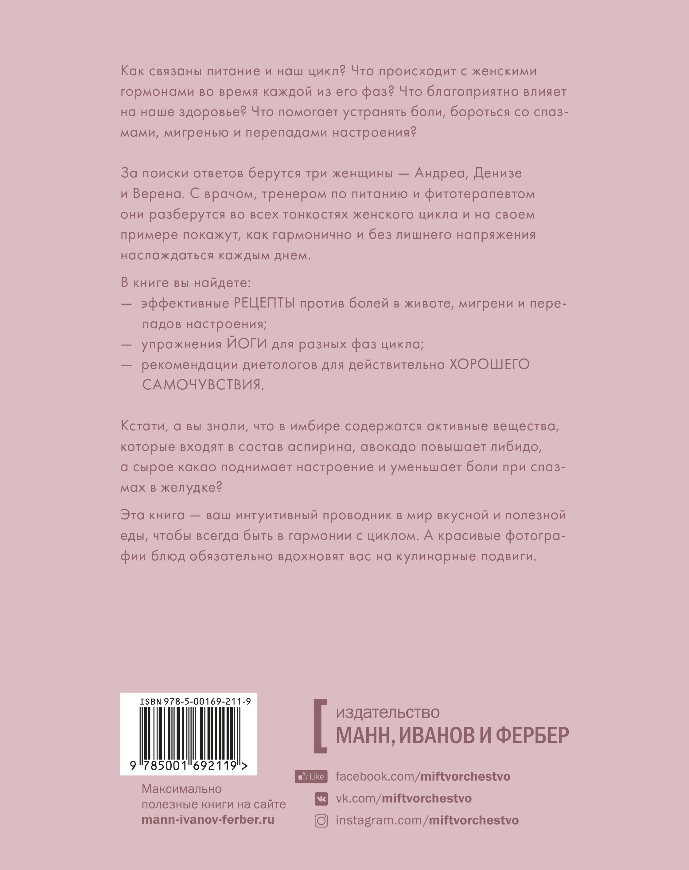 "Ну вот, опять менструация!" - ежемесячно восклицают тысячи женщин. Это значит: кровотечения, отеки, боли в животе и спине, усталость и перепады настроения. Но почему месячные для нас - такое испытание? Почему мы не можем позволить себе просто расслабиться? Что на самом деле каждый месяц происходит в нашем сложном организме? Книга расскажет: Что происходит с гормонами на протяжении 28 дней. Как правильное питание может повлиять на разные фазы цикла. Что полезно для женщины. Как облегчить болезненность менструаций. Авторы решили разобраться в самой сути женского цикла и привлекли к своим исследованиям врача - специалиста по гинекологии и акушерству Керстин Брус, фитопрактика и эксперта по ароматерапии Кристине Вагнер, специалиста по вопросам питания и традиционной китайской медицины Сандру Нова. Над книгой трудилась команда из восьми специалистов. В итоге получилось собрание рецептов вкусных и полезных блюд, которые помогут позаботиться об организме в разные фазы цикла. Авторы также демонстрируют позы йоги, способствующие расслаблению, налаживанию менструального цикла, улучшению самочувствия и обретению внутренней гармонии. Правильно подобранные ингредиенты и блюда, приготовленные исключительно из продуктов растительного происхождения, способствуют устранению менструальных болей и перепадов настроения. От авторов: Что каждый месяц происходит в нашем сложном организме? И чем тут поможет поваренная книга? Ответы очевидны: То, что мы едим, влияет на все процессы. И на женский цикл тоже. Мы можем облегчить неприятные симптомы. Достаточно отказаться от определенных продуктов и заменить их теми, что окажут благотворное влияние на организм в критические дни. Специально подобранный рацион питания способен поддержать нас во всех фазах цикла. Кроме того, все продукты, о которых пойдет речь, просто вкусные. Да и готовить их - сплошное удовольствие. Осознанное и бережное обращение со своим телом и душой - залог хорошего самочувствия. Прислушиваясь к себе, мы можем многому научиться. Прежде всего, доверять своему организму и его сигналам. Нам хотелось бы поделиться этими знаниями с вами. Заключите мир с критическими днями, станьте ближе к самим себе и возьмите на себя ответственность за собственное здоровье и самочувствие. Последним штрихом к всесторонней программе саморазвития и самопознания станет подборка упражнений йоги и материалы рубрики "Время для себя". Нам хочется, чтобы вы, остановившись в суматохе будней, пережили несколько приятных моментов наедине с собой. А что касается правила современного мира "Работай круглосуточно и выкладывайся на 120%", - его можно нарушить со спокойной душой.| Издательство | МАНН, ИВАНОВ И ФЕРБЕР ООО |