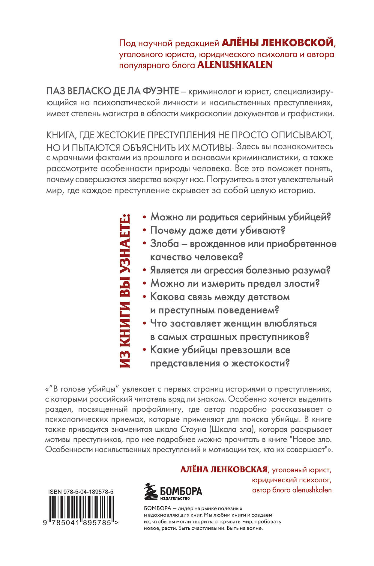 Дикие животные никогда не убивают ради развлечения. Человек - единственное существо, кому муки и смерть собратьев доставляют радость. «"В голове убийцы" увлекает с первых страниц историями о преступлениях, с которыми российский читатель вряд ли знаком. Особенно хочется выделить раздел, посвященной профайлингу, где автор подробно рассказывает о психологических приемах, которые применяют для поиска убийцы. В книге также приводится знаменитая шкала Стоуна (Шкала зла), которая раскрывает мотивы преступников, про нее подробнее можно прочитать в книге "Новое зло. Особенности насильствен-ных преступлений и мотивации тех, кто их совершает"». - Алёна Ленковская, уголовный юрист, юридический психолог, автор блога alenushkalen Человек начал убивать себе подобных, как только научился вертикально держаться на ногах. В самом древнем в мире захоронении, Сима де Лос Уэсос на севере Испании, возможно, покоятся останки первой в истории жертвы убийства. Археологи обнаружили в пещере череп возрастом 430 тысяч лет с большим отверстием спереди. Его обладателя убили тяжелым тупым предметом, два удара по направлению сверху вниз пробили лобную кость над левым глазом жертвы. С научной точки зрения, это один из первых задокументированных случаев убийства в истории человечества.| Издательство | ООО "Издательство "Эксмо" |