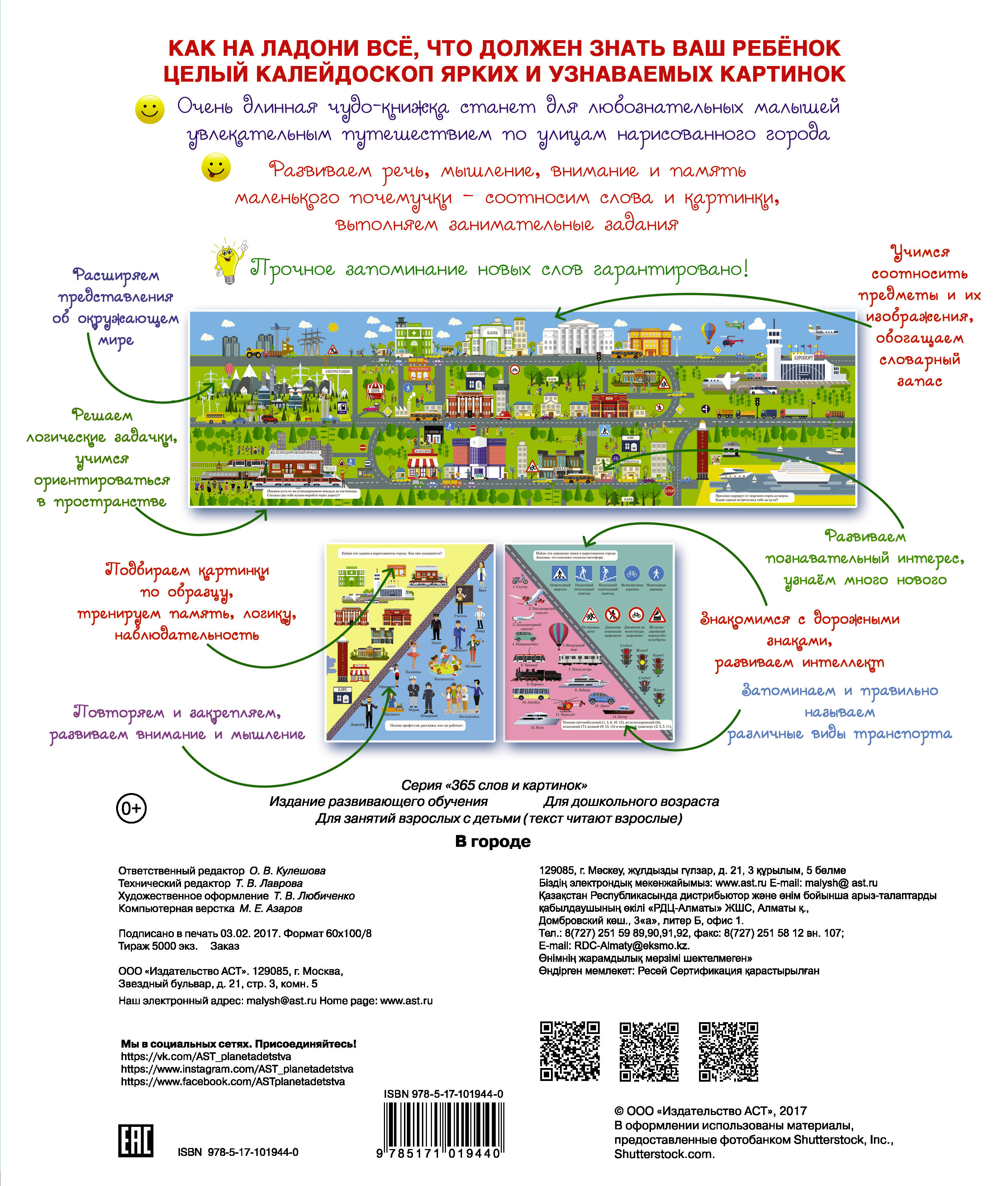 Новая книжка-гляделка в серии «365 слов и картинок» - путешествие по нарисованному городу. Это развлекательная книжка для малыша, мамы и папы, которые очень любят проводить время вместе. Потрясающая, красивая, яркая книжа-картинка большого формата для развития речи, воображения, наблюдательности и смекалки. Вместе с нарисованными человечками малыш побывает в порту, в парке, совершит экскурсии по городу, отправится в цирк и узнает много интересного. Путешествие по красочным страницам - это не только развлечение, но и возможность открыть для себя мир.| Издательство | ИЗДАТЕЛЬСТВО "АСТ" |
